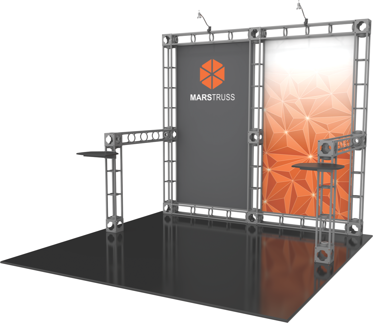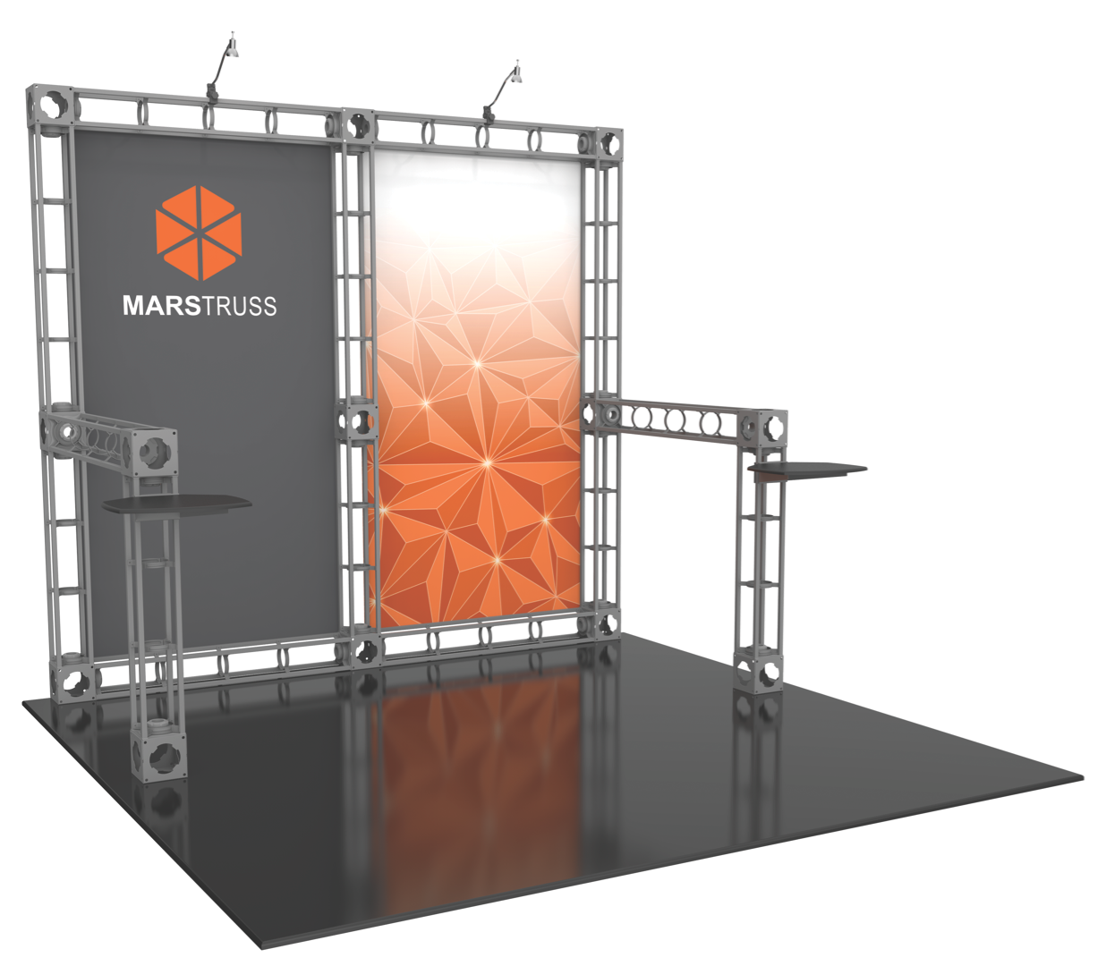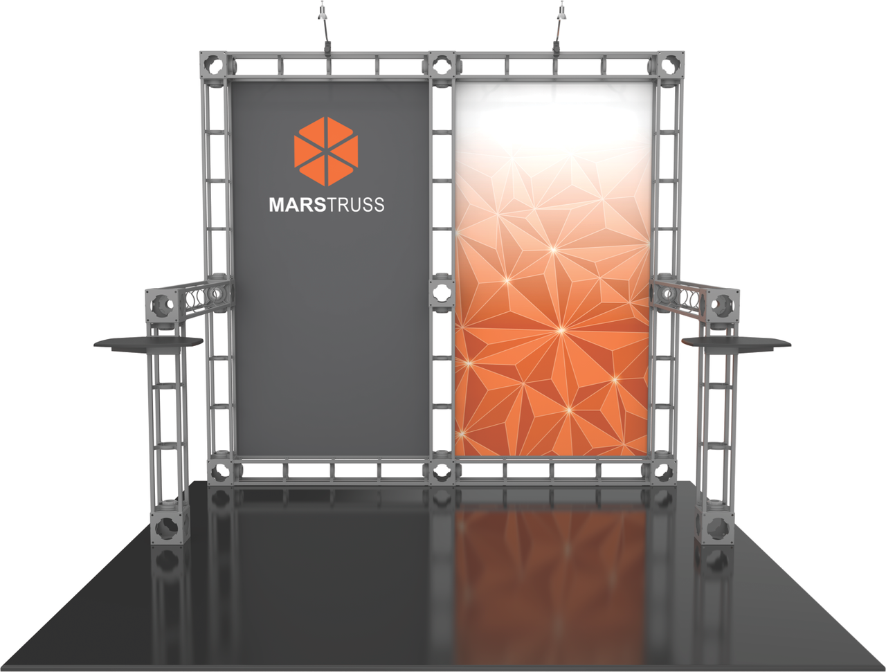 Elegant and classy, the 10’x10' Mars trade show truss display system gives you two center graphic display areas to showcase your brand. And with shelves on both sides of the display, you can display products and literature to everyone walking by at the trade show or event. Add on an LCD monitor mount to give your 10'x10' Mars trade show display some media marketing power! The 10'x10' Mars trade show system is simple to use, setup, and breakdown - no wonder it's one of our most popular truss display systems! Featured Package Includes: (5) 36" Truss Lengths(9) 46" Truss Lengths(13) 6-Way Junction Boxes(2) Adjustable Table Tops(2) 50W Spotlights(1) OCF Heavy Duty Case(1) OCH Heavy Duty Case(1) Quicklock Tool(1) Full Set of Quicklock Connectors Optional Upgrades:(2) LED Lights (1) Additional Monitor Mount(2) Additional Table Tops **FREIGHT GROUND SHIPPING INCLUDED IN PRICE**