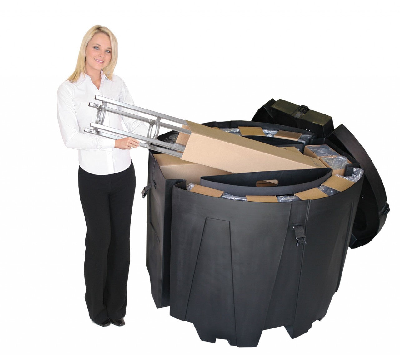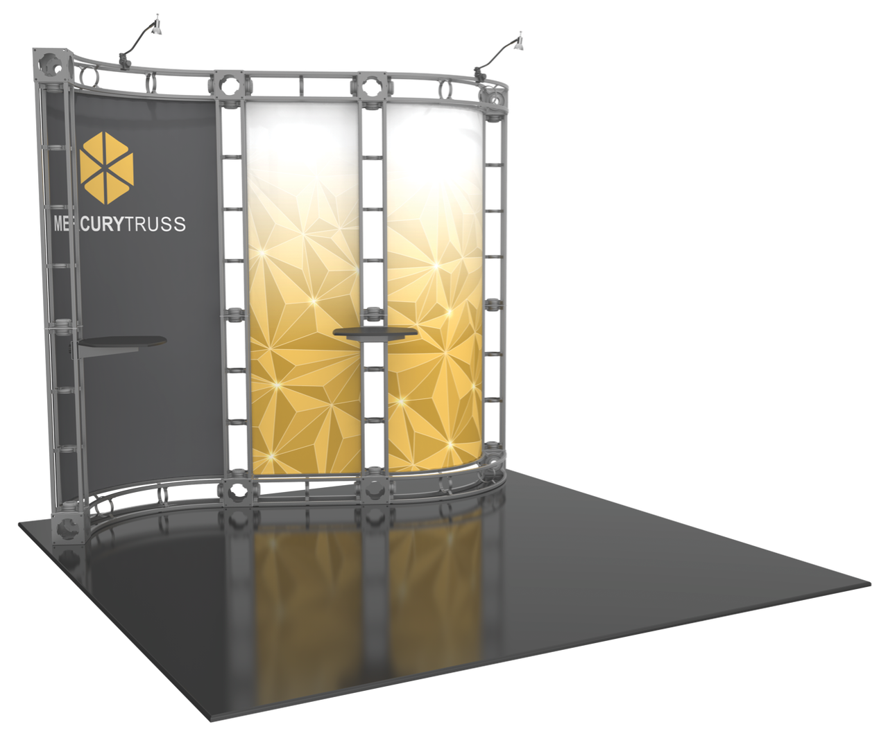 The 10'x10' Mercury trade show display brings a wave shape to your truss display, allowing you to utilize three tall center graphic panels to show-off your message and brand. Complete with two 50W spotlights, the Mercury is a simple and effective tradeshow system when trying to make a statement. The Mercury trade show display is capable of housing an LCD bracket (not included), as well as multiple shelves throughout the system (two shelves included). Featured Package Includes: (6) 36" Truss Lengths(4) 46" Truss Lengths(10) 45˚Curved Truss Lengths(16) 6-Way Junction Boxes(1) Adjustable Table Top(3) 50W Spotlights(1) Heavy Duty Case(1) Quicklock Tool(1) Full Set of Quicklock Connectors Optional Upgrades:(3) LED Lights (1) Additional Monitor Mount(2) Additional Table Tops **FREIGHT GROUND SHIPPING INCLUDED IN PRICE**