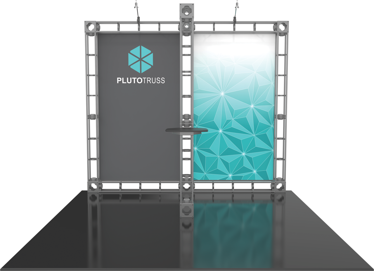 The 10'x10' Pluto truss trade show display is designed to give you two large surfaces to display and showcase your graphic materials. The Pluto display provides a well lit platform with plenty of graphic area to highlight your branding during any trade show or event. The additional truss support in front also allow for shelving and/or monitor mounts (not included) to be attached. Turn your truss trade show display into a functional media display. The customization is up to you when exbihiting! Featured Package Includes: (4) 36" Truss Lengths(9) 46" Truss Lengths(8) 6-Way Junction Boxes(1) Adjustable Table Top(2) 50W Spotlights(1) OCF Heavy Duty Case(1) Full Set of Quicklock Connectors Optional Upgrades:(2) LED Lights (1) Additional Monitor Mount(2) Additional Table Tops **FREIGHT GROUND SHIPPING INCLUDED IN PRICE**