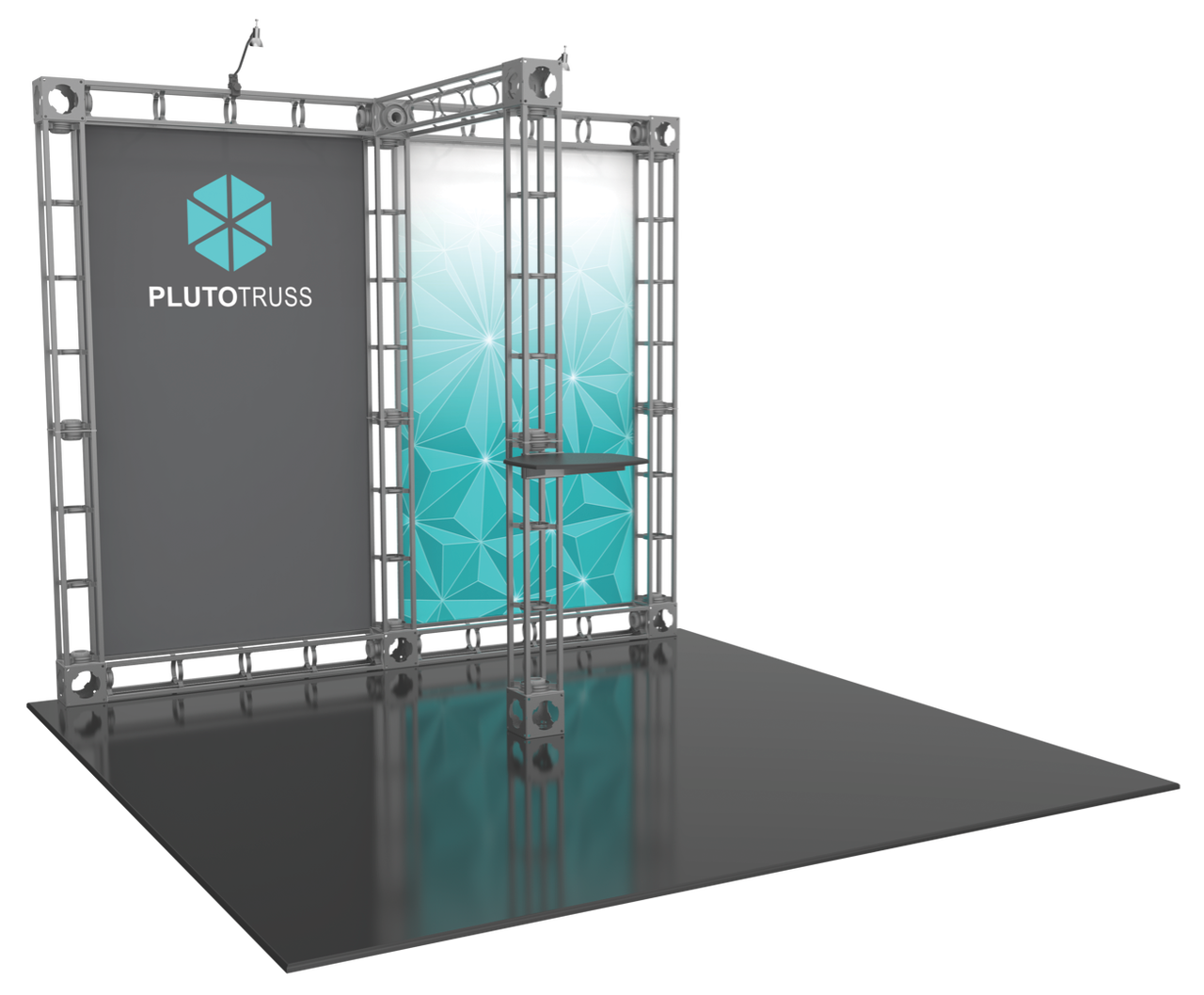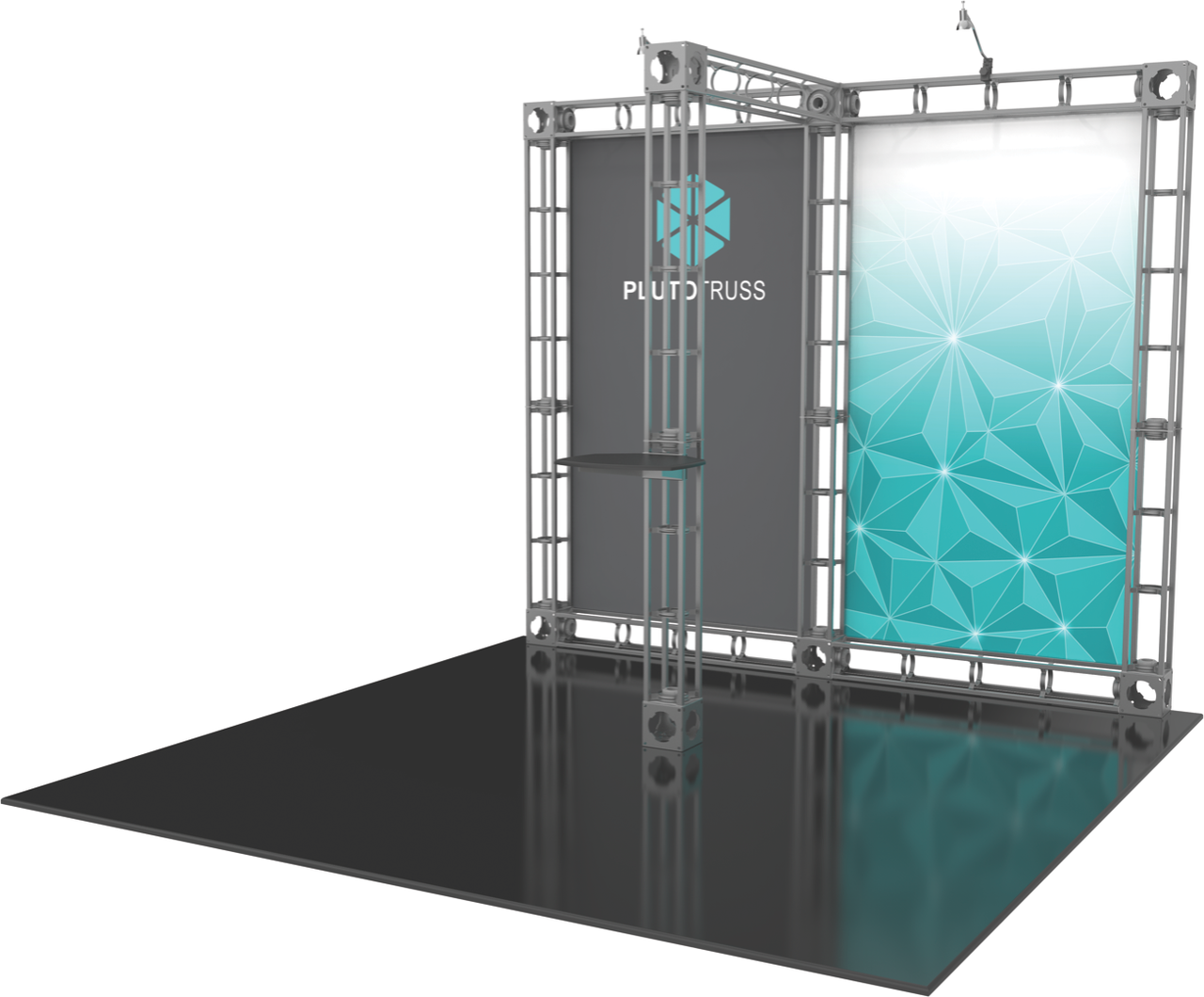 The 10'x10' Pluto truss trade show display is designed to give you two large surfaces to display and showcase your graphic materials. The Pluto display provides a well lit platform with plenty of graphic area to highlight your branding during any trade show or event. The additional truss support in front also allow for shelving and/or monitor mounts (not included) to be attached. Turn your truss trade show display into a functional media display. The customization is up to you when exbihiting! Featured Package Includes: (4) 36" Truss Lengths(9) 46" Truss Lengths(8) 6-Way Junction Boxes(1) Adjustable Table Top(2) 50W Spotlights(1) OCF Heavy Duty Case(1) Full Set of Quicklock Connectors Optional Upgrades:(2) LED Lights (1) Additional Monitor Mount(2) Additional Table Tops **FREIGHT GROUND SHIPPING INCLUDED IN PRICE**