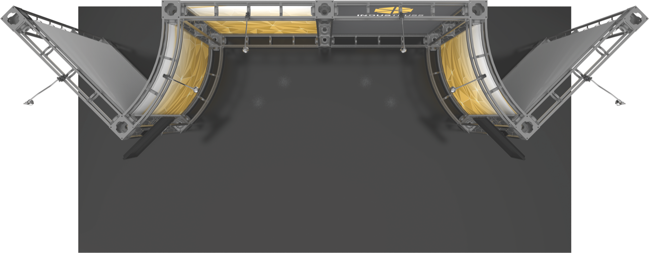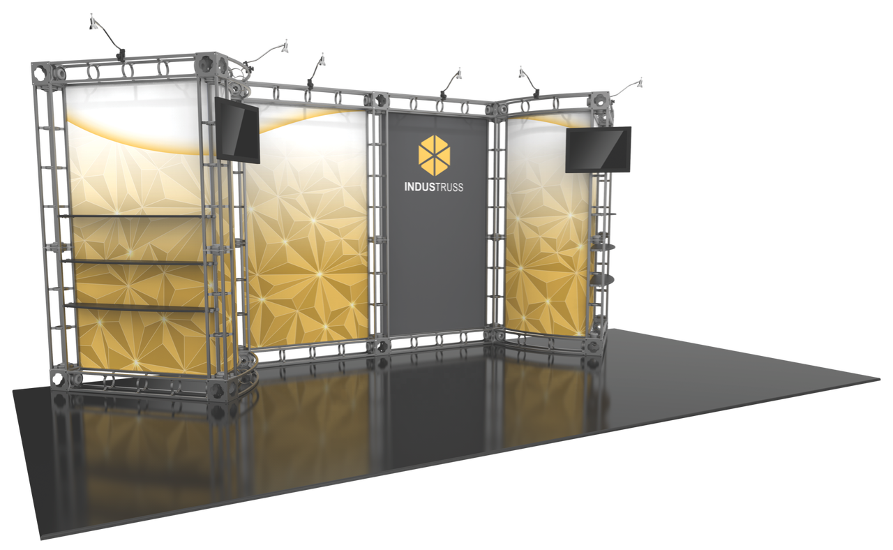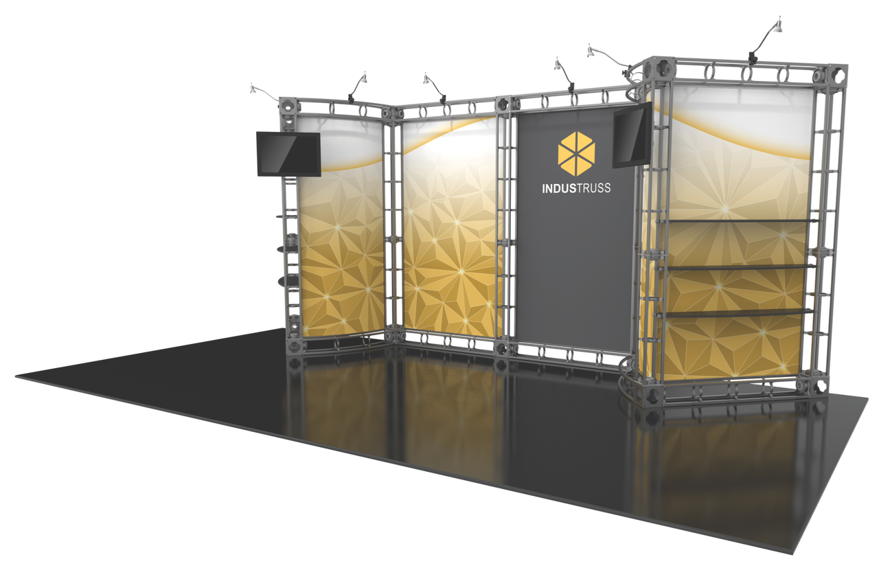 The 10'x20' Indus truss display is truly one of a kind, giving you six large display walls in total to showcase your custom graphics. Make your brand known with two large wings that both provide an internal and external graphic element when exhibiting at trade shows and events. The external pieces of the truss display kit also house rows of shelving, making it a perfect display when showcasing important products products. The Indus trade show display also sports six 50W spotlights to highlight your products and brand. Add a monitor mount (or two!) to enhance the look and feel of your exhibit booth even further. Featured Package Includes: (7) 36" Truss Lengths(15) 46" Truss Lengths(4) 45˚Curved Truss Lengths(14) 6-Way Junction Boxes(6) 46" Shelves(6) 50W Spotlights(2) OCF Heavy Duty Cases(1) Full Set of Quicklock Connectors Optional Upgrades:(6) LED Lights (2) Monitor Mount(2) Additional Table Tops **FREIGHT GROUND SHIPPING INCLUDED IN PRICE**