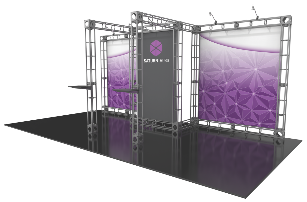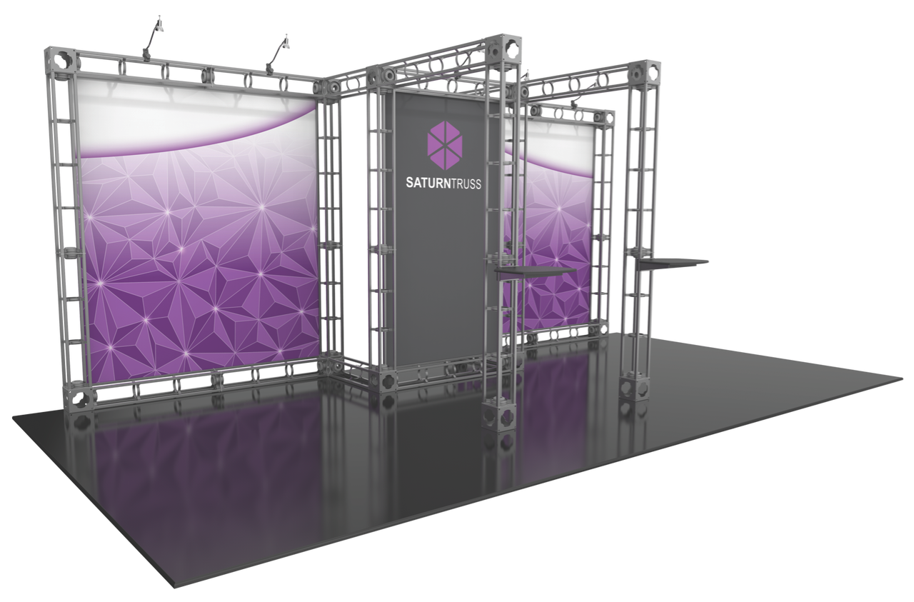 The 10'x20' Saturn truss display system is perhaps our most commanding truss display kit. This beautiful trade show display offers a stunning center graphic display wall, along with two additional 6' wings for maximum brand exposure at conventions. Utilize this real estate to make an impact with your custom artwork, and stop your prospective buyers dead in their tracks! Taking customization a step further, you can add additional shelving and LCD brackets to this truss display system to support your rich media needs. Five 50W spotlights are included (upgrade to LED for an even bigger show stopper) to further highlight your brand at trade shows. Featured Package Includes: (4) 24" Truss Lengths(16) 36" Truss Lengths(12) 46" Truss Lengths(16) 6-Way Junction Boxes(2) Adjustable Table Tops(5) 50W Spotlights(2) OCF Heavy Duty Cases(1) Full Set of Quicklock Connectors Optional Upgrades:(6) LED Lights (1) Monitor Mount(2) Additional Table Tops **FREIGHT GROUND SHIPPING INCLUDED IN PRICE**