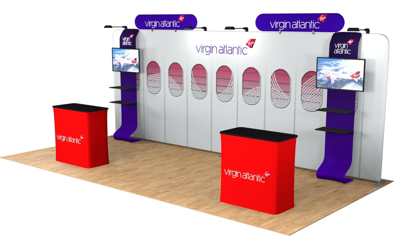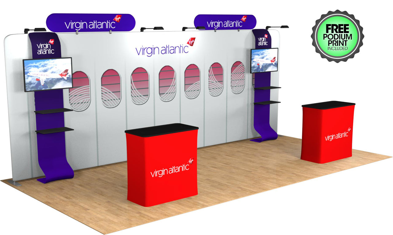 Introducing the newest and most impressive addition to the Tru-Fit series: the 20' Tru-Fit MEGA MAX Media Kit. This magnificent 20' multi-media kit brings together several of our top selling displays to form a unique package designed for maximum branding and media power, allowing you to market your product on a whole new level at trade shows. The 20' Tru-Fit MEGA MAX trade show display features a seamless 20' fabric dye sub backdrop and two Tru-Fit MAX add-ons. Each MAX add-on contains a waterfall TV stand with two aluminum shelves and a TV mounting bracket, a custom printed header. The shelving unit is ideal for product displays or keyboard and mouse placement, so your prospective clients can have an interactive experience during the trade show. The Tru-Fit MEGA MAX also has maximum portability! Two hard cases can house the entire display, frame, graphics and all, allowing you to move easily to and from each trade show or event. The podium conversion kits allows you to convert the hard cases into a professional-looking podium stands, ideal for displaying handouts or other marketing materials during trade shows. Check out our blog post HERE for a quick tutorial on how to set up the monitor bracket! Featured Package Includes: (1) 20ft High Resolution Zippered Tension Fabric Graphic Print (2) Header Tension Fabric Graphic Prints(2) Waterfall TV Stand Tension Fabric Graphic Prints(1) 20ft Aluminum Snap-Tube Frame(2) Header Snap-Tube Frames(2) Waterfall TV Stand Snap-Tube Frames(4) Black Aluminum Shelves (Supports up to 20lbs each)(2) TV Monitor Bracket (Supports up to 32" TV)**(2) LED Lights (2) Durable Hard Cases* with Wheels(2) Podium Conversion Kits, With Custom Graphic Print Let us design for you! Standard Design Services are offered at set rates based on 8 hours for backdrop, podium, header and TV stand design (single sided backdrop). Simply send us all of the design elements such as your logos, text, pictures, and anything else you would like included, and our team of experienced designers will create a custom, professional, and effective design for you! Please note: Double-Sided print designs will require additional design services IF the back side design is different from the front side. Additional design time will be assessed on a per project basis. For more information on our design services, CLICK HERE. *Case is designed for transport only. We highly recommend saving and reusing the cardboard shipping carton for future shipping purposes**TV Mount is VESA compliant with 200x200, 200x400, 300x300 or 400x400 mm