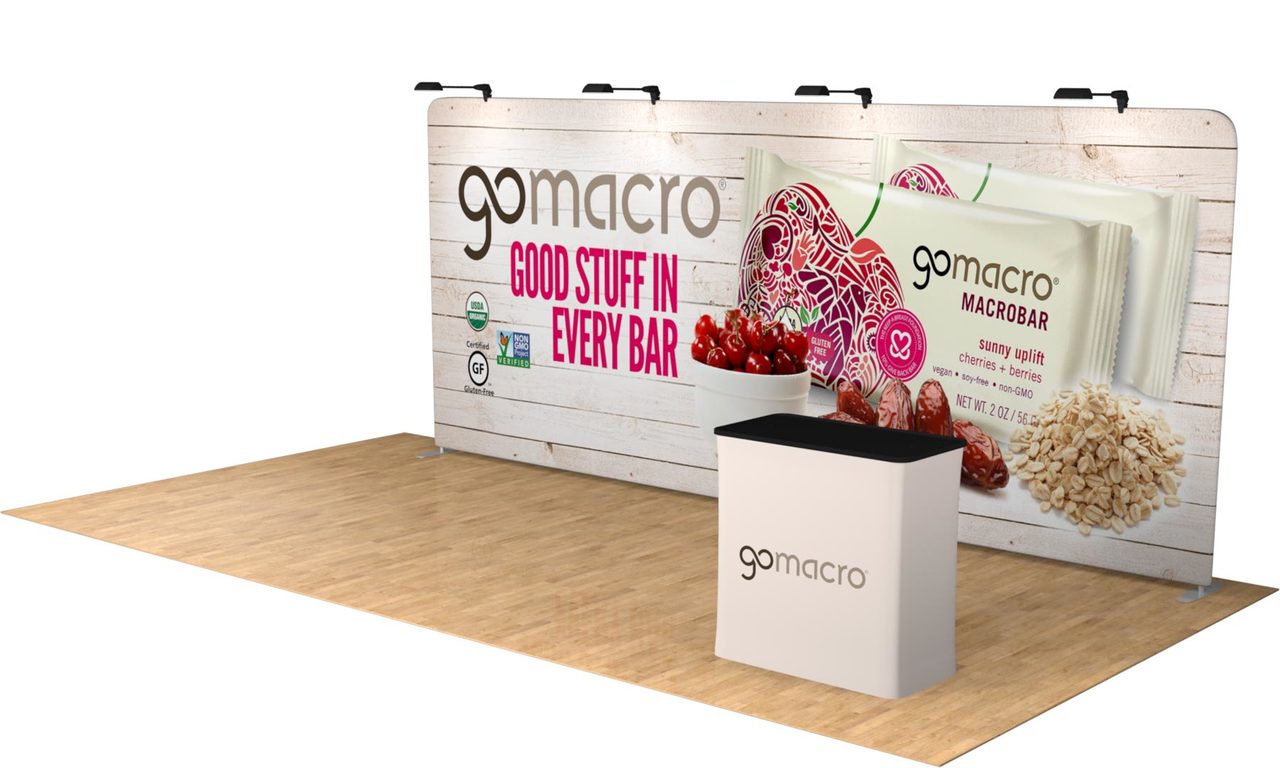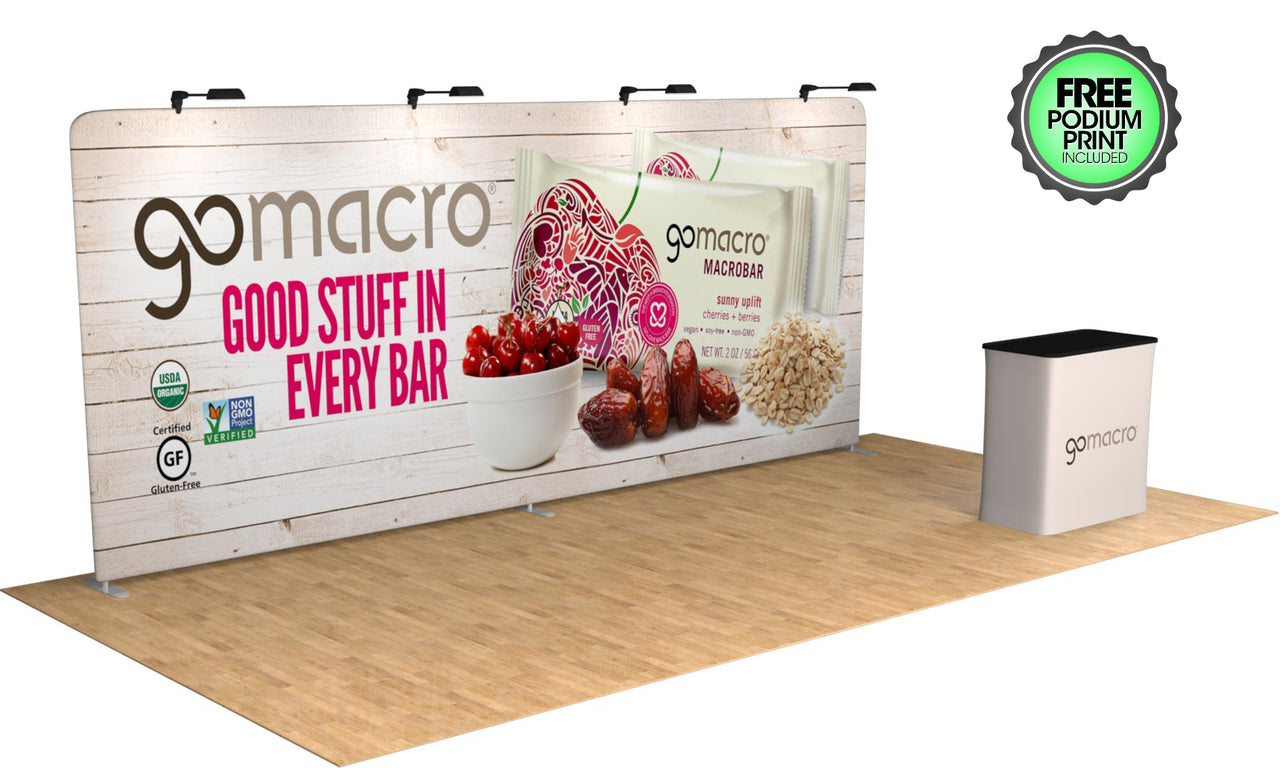 When it comes to 20' trade show displays, a custom graphic tension fabric display is your best choice! The Tru-Fit 20' Straight tradeshow display is part of our most popular line of portable displays. It is lighter, easier, and more seamless than any other 20' exhibit booth you have encountered. The entire display fits into a single hardshell transport case! Optional add-ons include choosing from a single or double-sided print and two additional LED lights. A double-sided print allows you to change your whole marketing message with a simple flip of the graphic. You will be prepared for any show. Be sure to check out our Tru-Fit Viper banner stands if you're looking to add extra marketing power to your trade show display! Featured Package Includes: (1) High Resolution Zippered Tension Fabric Graphic Print (1) 20' Aluminum Snap-Tube Frame(1) Durable Hard Case* w/ Podium Conversion Kit(1) Podium Graphic Print Optional Upgrades:(2) Additional LED Lights Double-Sided Graphic Let us design for you! Standard Design Services are offered at set rates based on 6 hours for backdrop + podium design (single sided backdrop). Simply send us all of the design elements such as your logos, text, pictures, and anything else you would like included, and our team of experienced designers will create a custom, professional, and effective design for you! Please note: Double-Sided print designs will require additional design services IF the back side design is different from the front side. Additional design time will be assessed on a per project basis. For more information on our design services, CLICK HERE. *Case is designed for transport only. We highly recommend saving and reusing the cardboard shipping carton for future shipping purposes