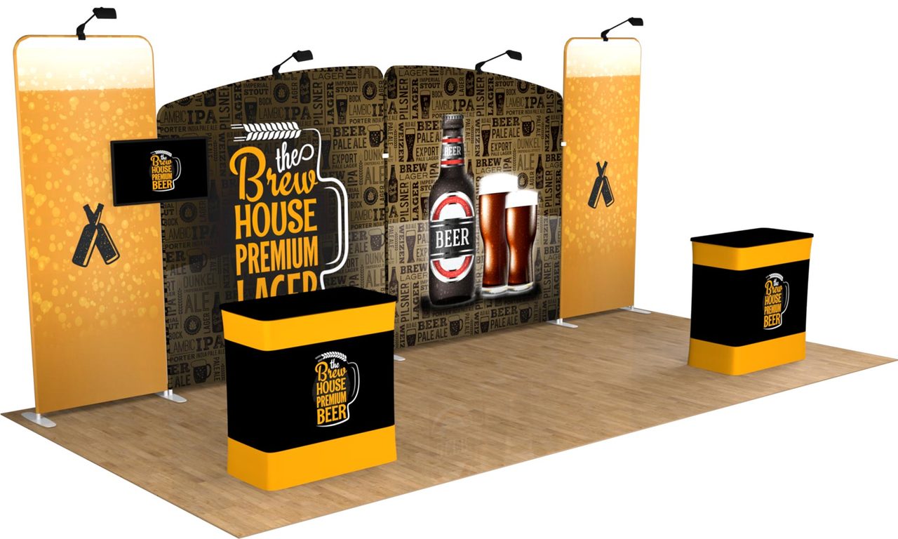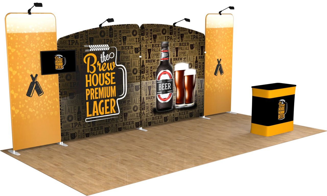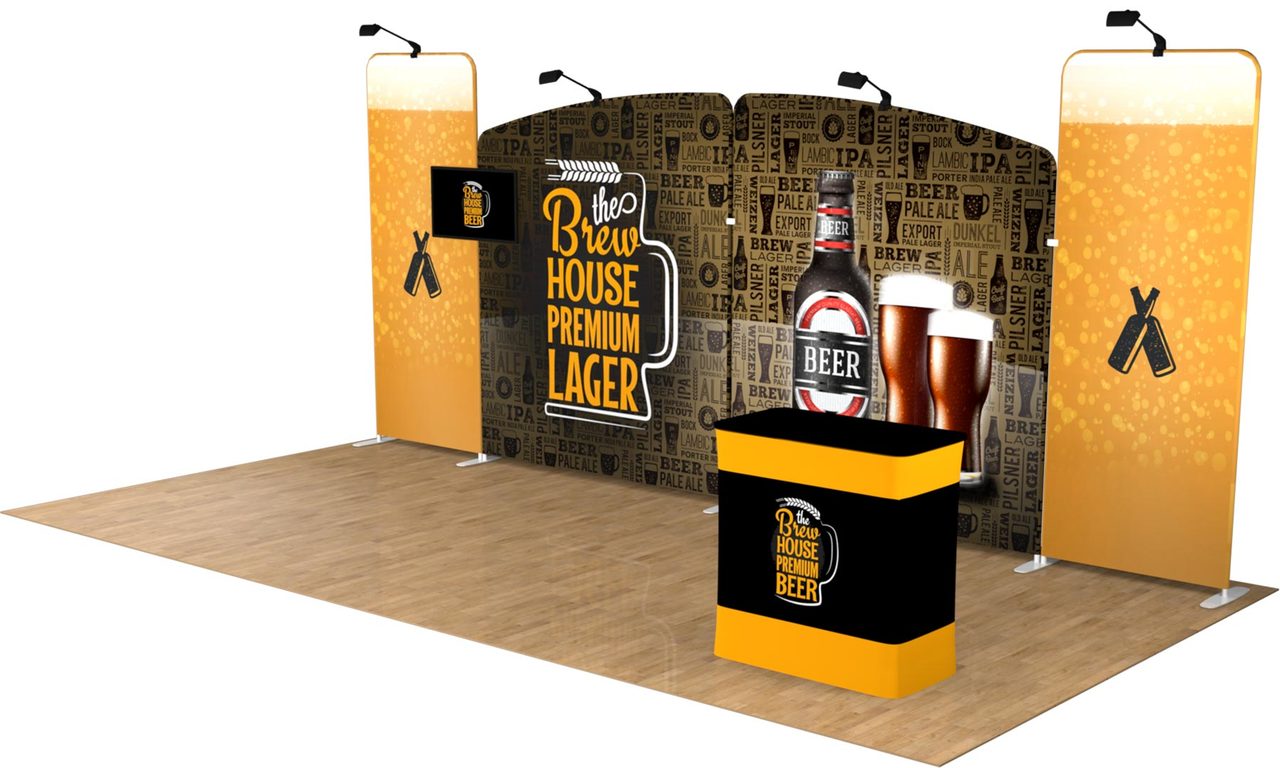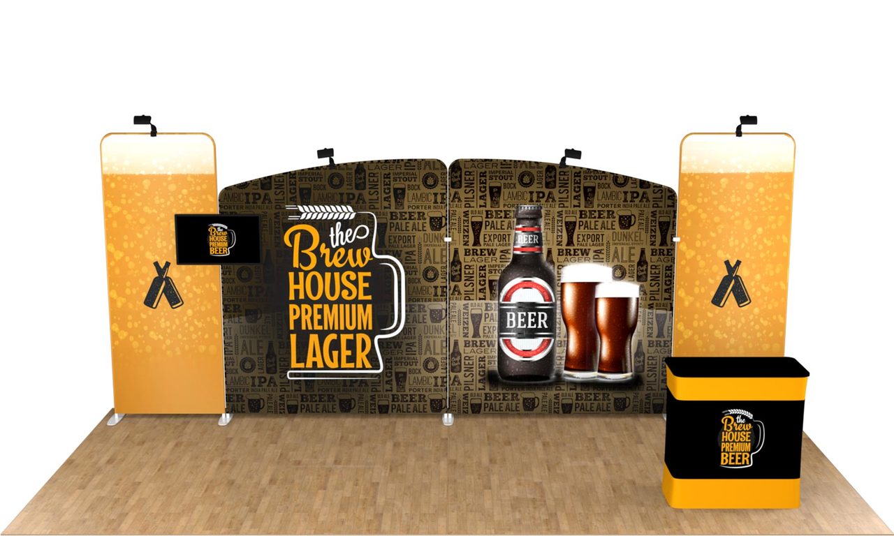Adaptable. Versatile. Accommodate any and all of your booth sizes for your upcoming shows! 8ft? 10ft? 15ft? 20ft?! The Tru-Fit Monument trade show display package is the most convenient and efficient portable trade show booth system for you to maximize your ROI no matter the exhibit space. This premium package includes four panels that can be used together or as separate backdrops, allowing endless exhibiting possibilities. Consider adding back-side prints or a second podium/case for double the marketing power. Featured Package Includes:(2) 6.5'w x 7.5'h High Resolution Zippered Tension Fabric Graphic Print (2) 3'w x 8'h High Resolution Zippered Tension Fabric Graphic Prints(2) 6.5'w x 7.5'h Aluminum Snap-Tube Frame (2) 3'w x 8'h Aluminum Snap-Tube Frames(1) TV Monitor Bracket (Supports 40" TV up to 32 lbs)**(4) LED Lights (1) Durable Hard Case* with Wheels(1) Podium Conversion Kit, With Custom Graphic Print(2) Single Slot Support Feet(2) Double Slotted Support Feet Optional Upgrades:Additional Hard Case with Podium Conversion (ideal to help transport graphic prints)Double-Sided Printing (Back-Side Graphics) Let us design for you! Standard Design Services are offered at set rates based on 6 hours for backdrop + podium design (single sided backdrop). Simply send us all of the design elements such as your logos, text, pictures, and anything else you would like included, and our team of experienced designers will create a custom, professional, and effective design for you! Please note: Double-Sided print designs will require additional design services IF the back side design is different from the front side. Additional design time will be assessed on a per project basis. For more information on our design services, CLICK HERE. *Case is designed for transport only. We highly recommend saving and reusing the cardboard shipping carton for future shipping purposes**TV Mount is VESA compliant with 200x200, 200x400, 300x300 or 400x400 mm