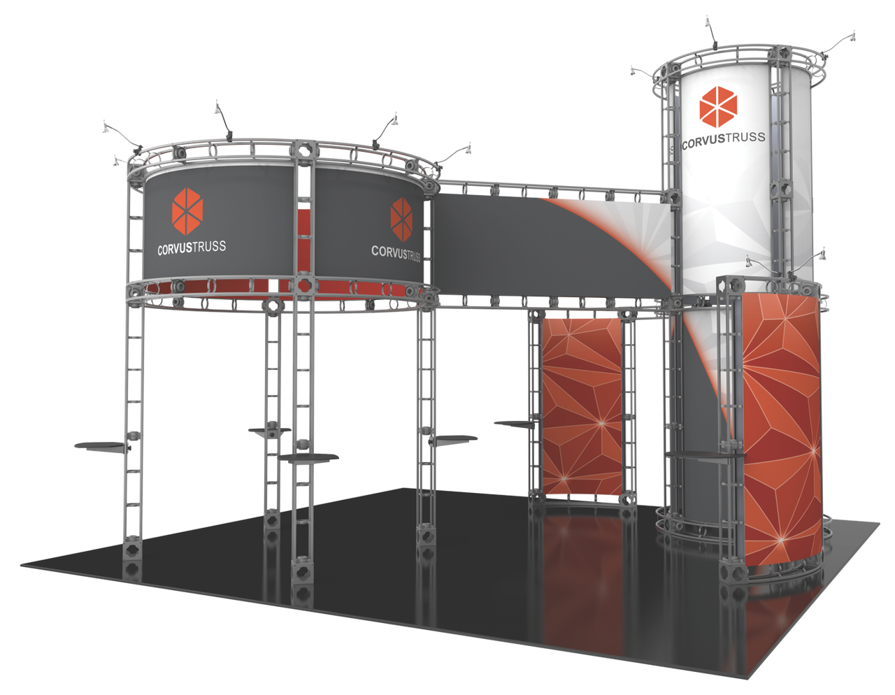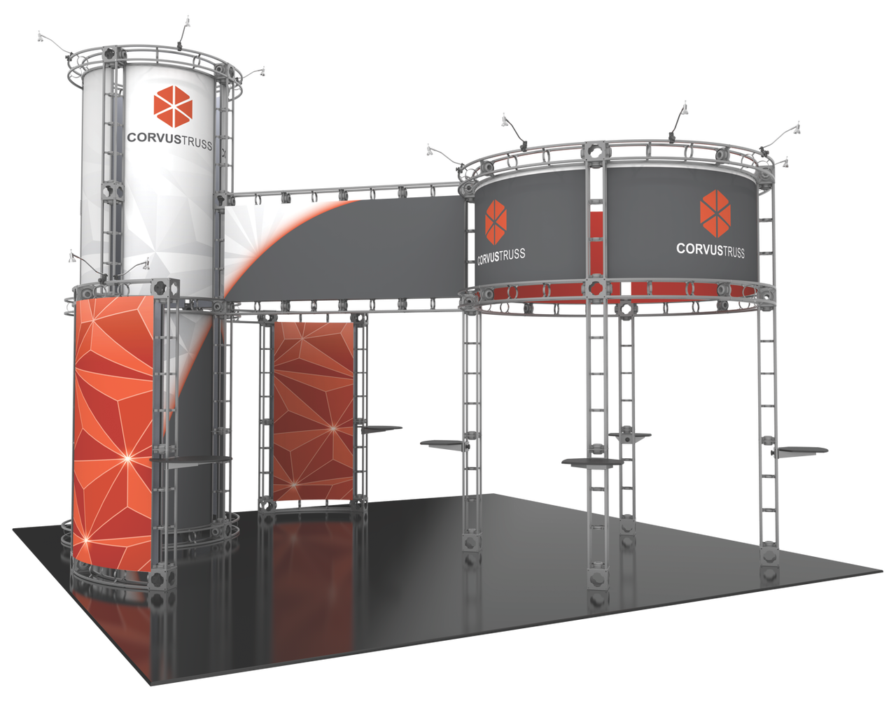 The 20'x20' Corvus truss display kit allows you to put the centerpiece of your design onto a particular side, and then creates a unqiue space for your team on the opposite side of the island to handle questions, or even host meetings and presentations during trade shows and events. The Corvus truss trade show display is designed to give you two platforms, one for your high resolution graphics and custom printing, and the other for a chance to discuss your products in services with your potential buyers, all while keeping your brand in tact. Complete with 20 50W spotlights, which you can upgrade to LEDs for an even bigger impact, and six adjustable tabletops, your brand and products will always be the hightlight of the trade show! Featured Package Includes: (8) 24" Truss Lengths(20) 36" Truss Lengths(16) 46" Truss Lengths(22) 45˚Curved Truss Lengths(12) 90˚Curved Truss Lengths(36) 6-Way Junction Boxes(20) 50W Spotlights(6) Adjustable Tabletops(4) OCF Heavy Duty Cases(1) OCT Heavy Duty Case(1) Full Set of Quicklock Connectors Optional Upgrades:(20) LED Lights (1) Monitor Mount(2) Additional Tabletops **FREIGHT GROUND SHIPPING INCLUDED IN PRICE**