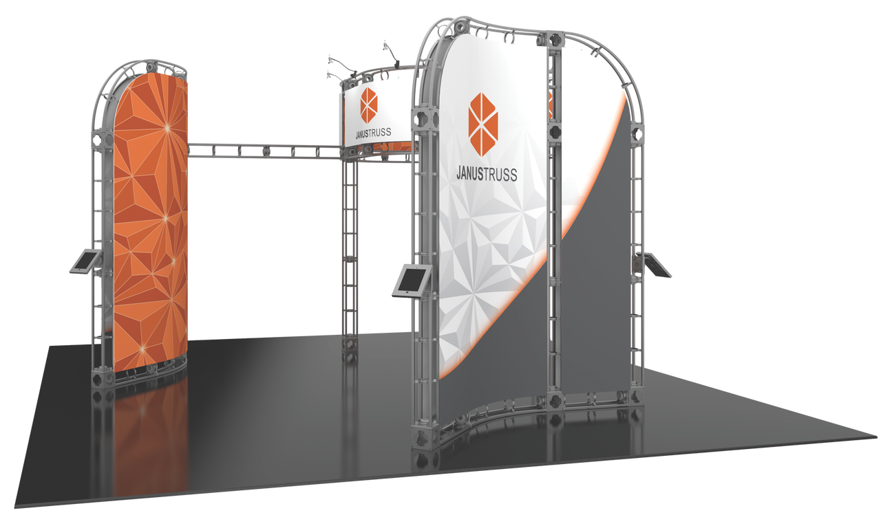 Be the hottest booth on the trade show floor with the 20'x20' Janus truss display system, giving you end to end floor coverage in your 20'x20' booth with its unique split system. The Janus truss trade show system provides an array of surface space that displays your custom graphics and put your brand and marketing message in front of every attendee. The 20'x20' Janus truss display delivers an "in-your-face" marketing strategy, but also provides an inviting enviroment to have meetings with potential leads during the trade show or event. Upgrade to LED lighting and add some tabletops to display your products! Featured Package Includes: (20) 24" Truss Lengths(14) 36" Truss Lengths(10) 46" Truss Lengths(4) 45˚Curved Truss Lengths(12) 90˚Curved Truss Lengths(26) 6-Way Junction Boxes(8) 50W Spotlights(2) OCF2 Heavy Duty Cases(1) OCT Heavy Duty Case(1) Full Set of Quicklock Connectors Optional Upgrades:(8) LED Lights (2) Monitor Mounts(2) Additional Table Tops **FREIGHT GROUND SHIPPING INCLUDED IN PRICE**