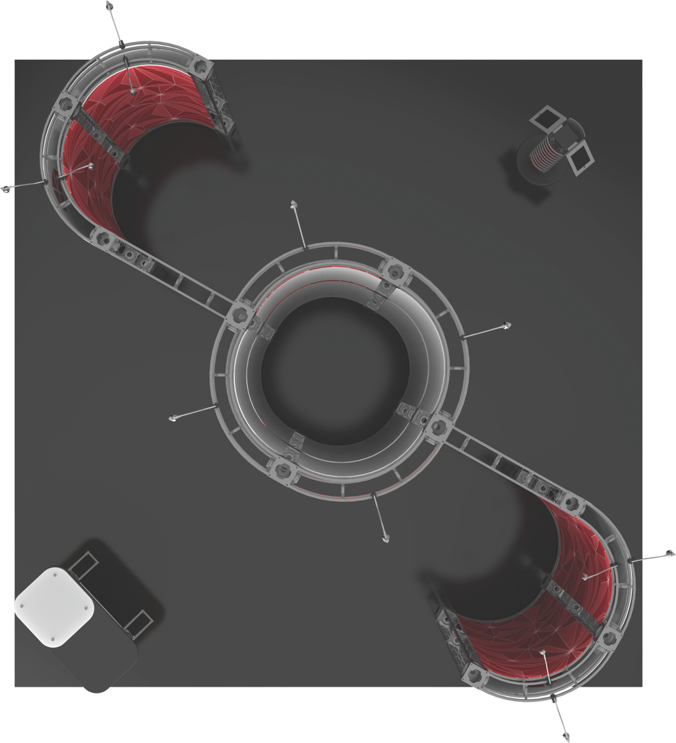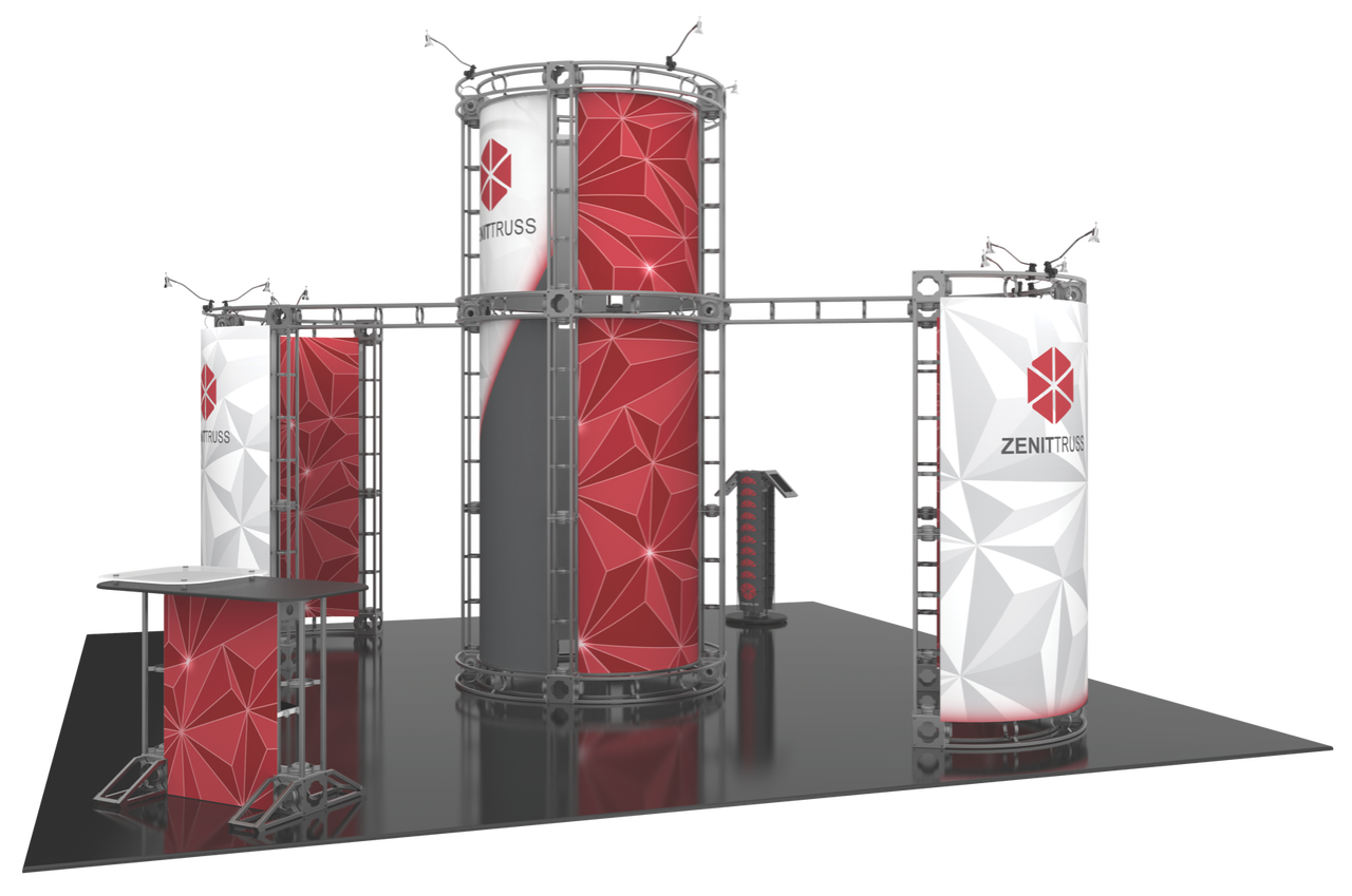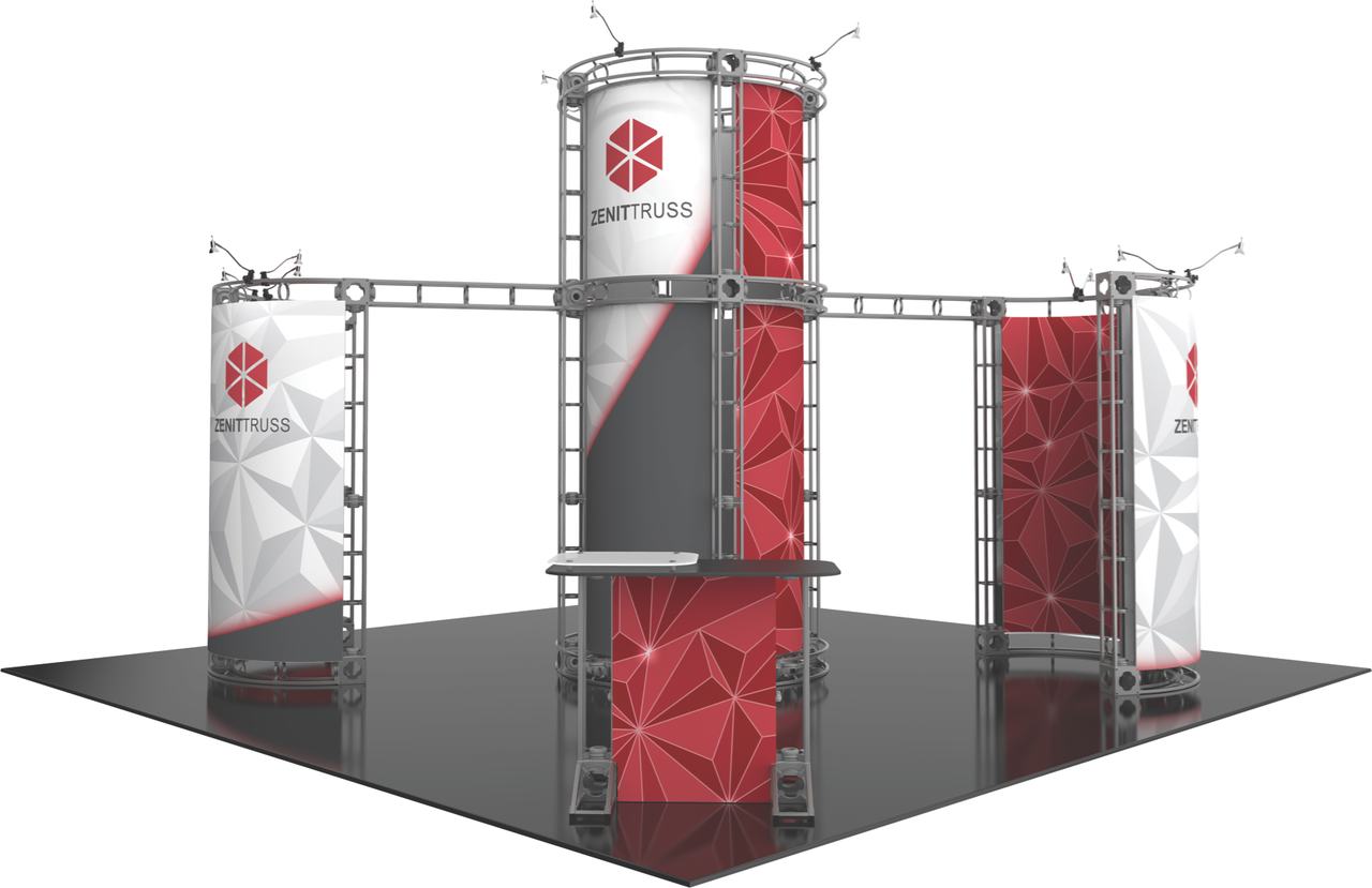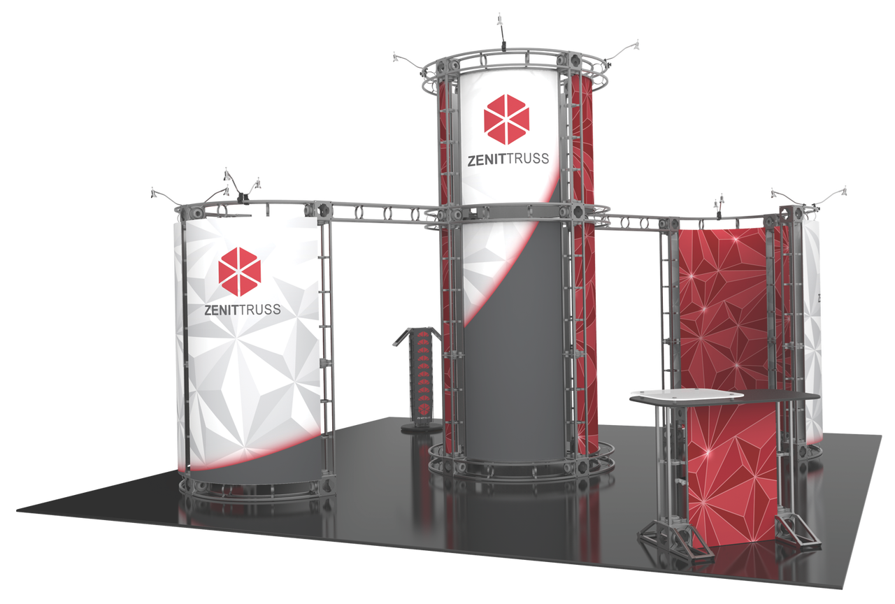 The 20'x20' Zenit is one of the most effective solutions to captivating your oncoming traffic and prospective buyers. By utilizing unique curves and shapes to get their attention, the Zenit trade show display harnesses the raw power of design to captivate your audience. The circular center-piece makes for an instant jaw-dropping effect, with a full 360° graphic offering to display your brand and marketing message at trade shows. Complete with a counter, an internal shelf to display products, and 12 50W spotlights, this truss display really is the total package! Featured Package Includes: (2) 24" Truss Lengths(2) 30" Truss Lengths(10) 36" Truss Lengths(16) 46" Truss Lengths(20) 90˚Curved Truss Lengths(24) 6-Way Junction Boxes(2) Junction Bases(1) Counter(1) 24" Internal Shelf(12) 50W Spotlights(1) OCF2 Heavy Duty Case(2) OCT Heavy Duty Cases(1) Full Set of Quicklock Connectors Optional Upgrades:(12) LED Lights (1) Monitor Mount(2) Additional Table Tops **FREIGHT GROUND SHIPPING INCLUDED IN PRICE**