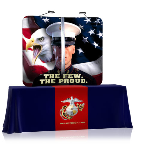 This 6' Tru-Fit Table Top QuickZip display is an efficient and dynamic solution to your tradeshow needs! The compact and lightweight design of the QuickZip display conserves both time and space making your trade show setup easy as pie! Transportation is extremely easy with softshell transport case with wheels. Upgrade to the hard case* & LED lights and save! This option also allows you to add a podium graphic to match the backdrop of your trade show display. You also have the option to print on one or both sides of the display for a full 360 degree marketing strategy! And, don't forget to purchase a printed table throw, to complete your table top exhibit. Featured Package Includes: (1) High Resolution Zippered Tension Fabric Graphic Print (1) Table Top Collapsible Extruded Aluminum Frame(1) Softshell Transport Case Optional Upgrades:(2) LED Lights(1) Durable Hard Case* w/ Podium Conversion Kit(1) Podium Graphic Print Let us design for you! Standard Design Services are offered at set rates based on 3 hours of work for backdrop only, and 4 hours for backdrop + podium design (single sided backdrop). Simply send us all of the design elements such as your logos, text, pictures, and anything else you would like included, and our team of experienced designers will create a custom, professional, and effective design for you! Please note: Double-Sided print designs will require additional design services IF the back side design is different from the front side. Additional design time will be assessed on a per project basis. For more information on our design services, CLICK HERE. *Case is designed for transport only. We highly recommend saving and reusing the cardboard shipping carton for future shipping purposes