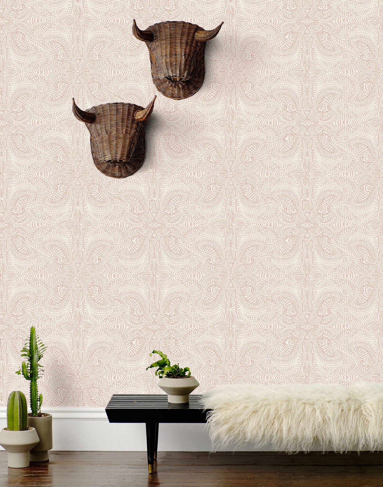 Dusty pink lace pattern on an off white background