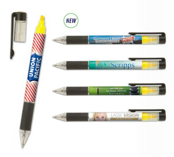 The business card pen gets even better with this duplex system, giving you ink on one end, and a highlighter on the other. Best of all, this involves a full 4-color CMYK print process, allowing you to print your entier business card or any graphic on the printable area. Amazing, and effective! Make an impact with this top of the line promotional pen that will extend the shelf life of your brand. Price includes one-time graphic setup fee of $85. Setup: $85 One Time Setup - Full 4-Color Process Trim: Clear Cap Imprint Area: 2.88" x 1.497" (See Sample Below) Safe Area: 2.613" x 1.26" Ink: Black Ink Standard, Blue Ink Optional Point: Medium Ballpoint Pack: 100 per box Weight: 2.6 lbs per box of 100 CT Leadtime: 5 Business Days
