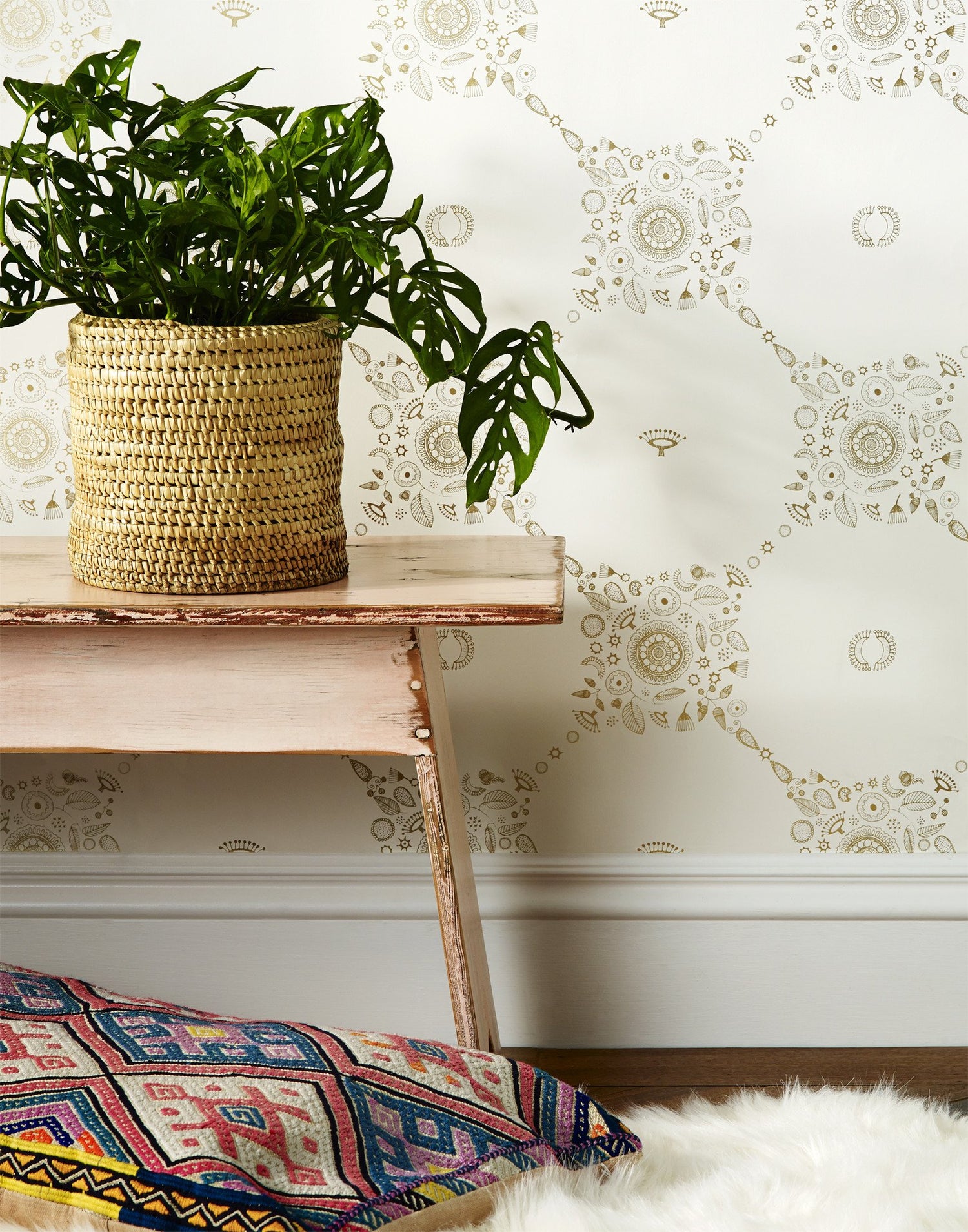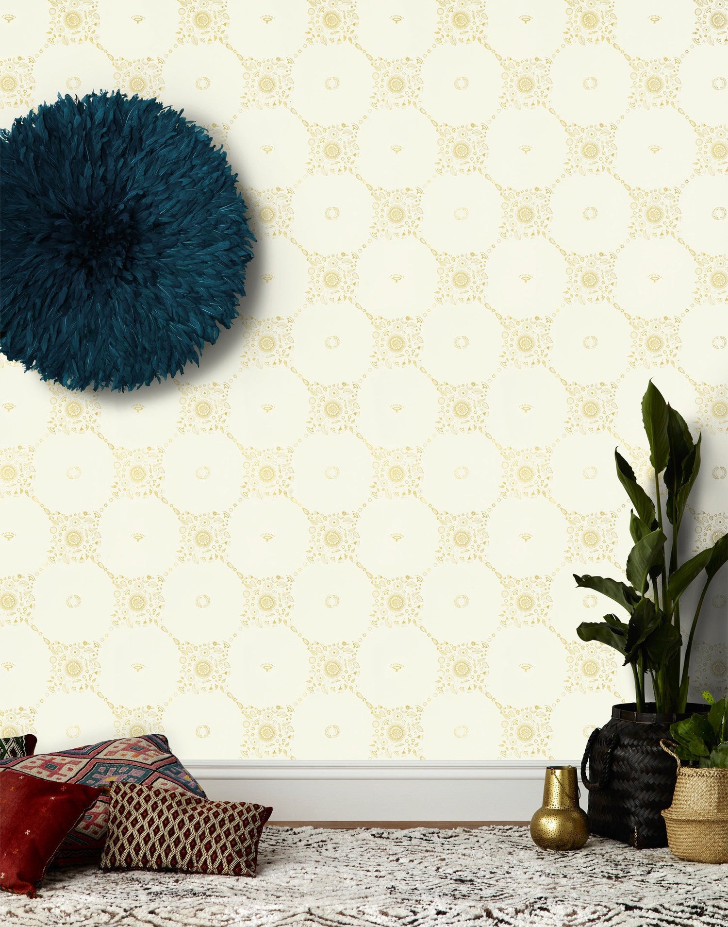 Inspired by the sun and moon in Suzani motifs, line drawings from the women painters of Mithila and a dizzying trip to Fez, Morocco, Fez wallpaper is meant to have a double effect. From afar the trellis shape invites onlookers to come closer, and once close, the magical symbols of suns, moons, stars and flowers appear.