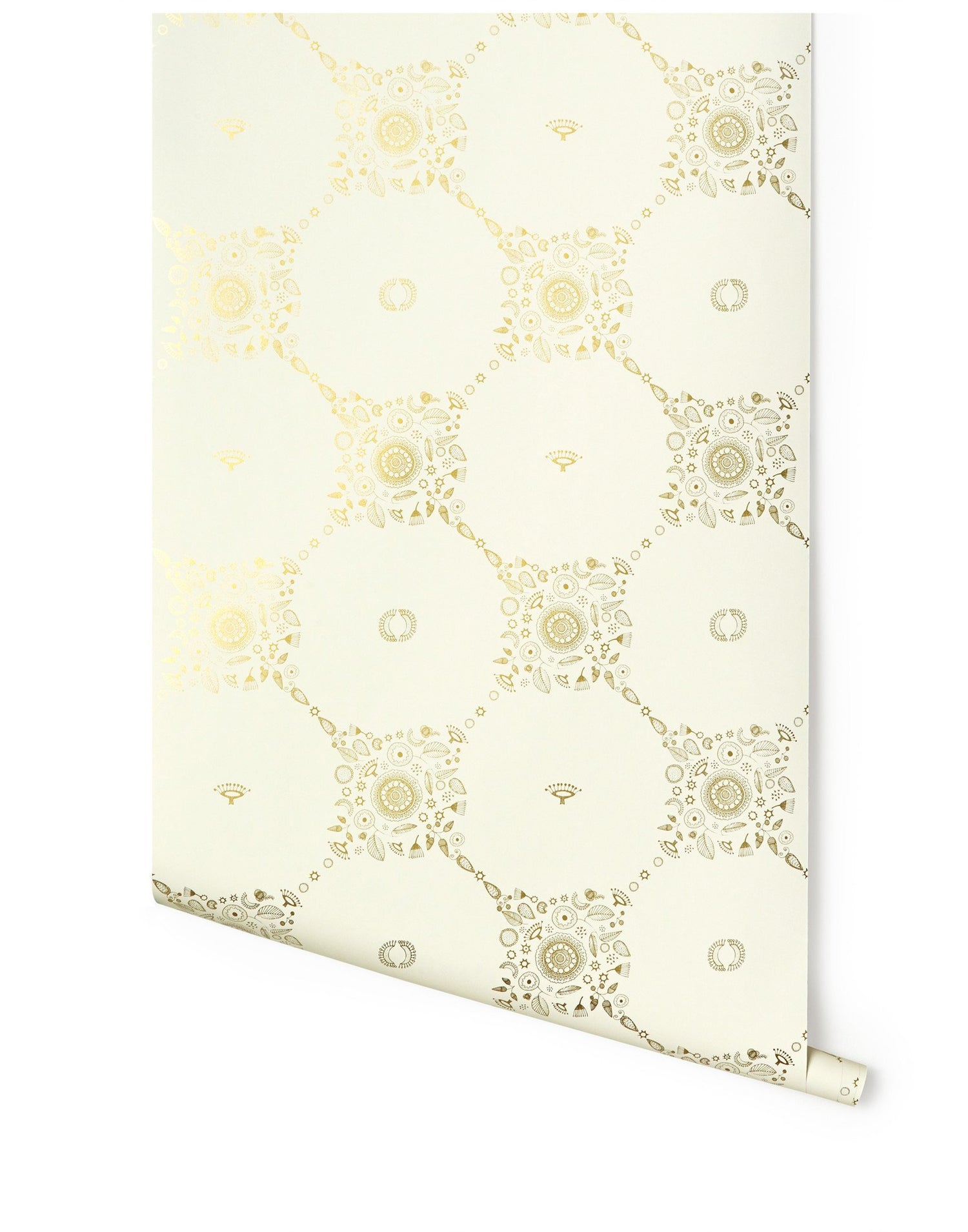 Gold trellis pattern on an off white background