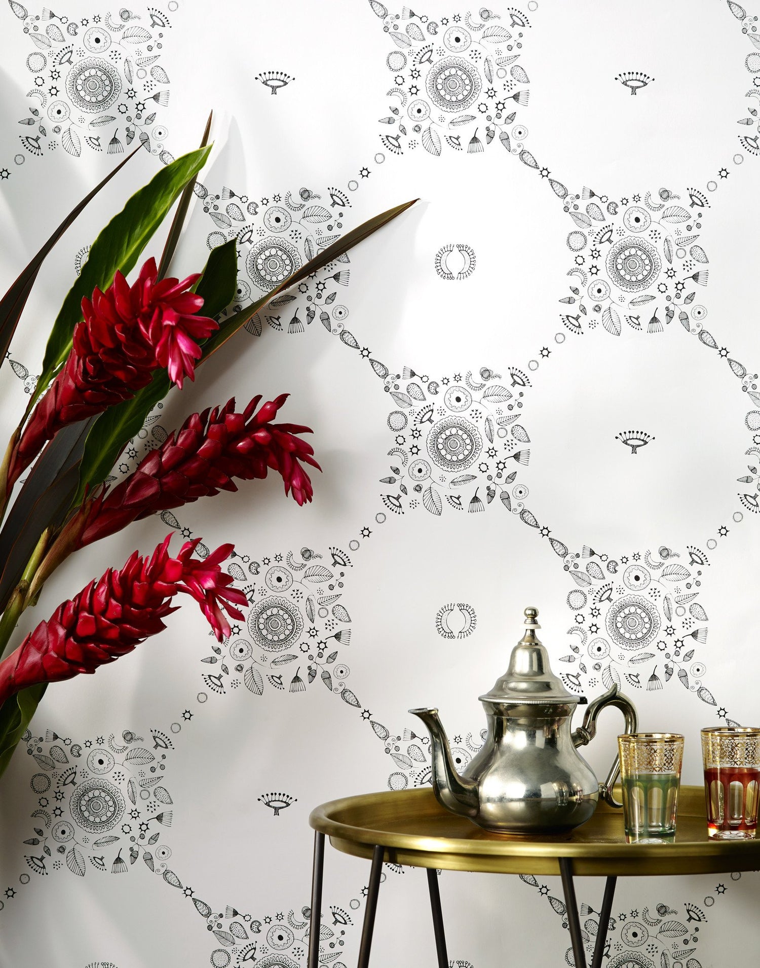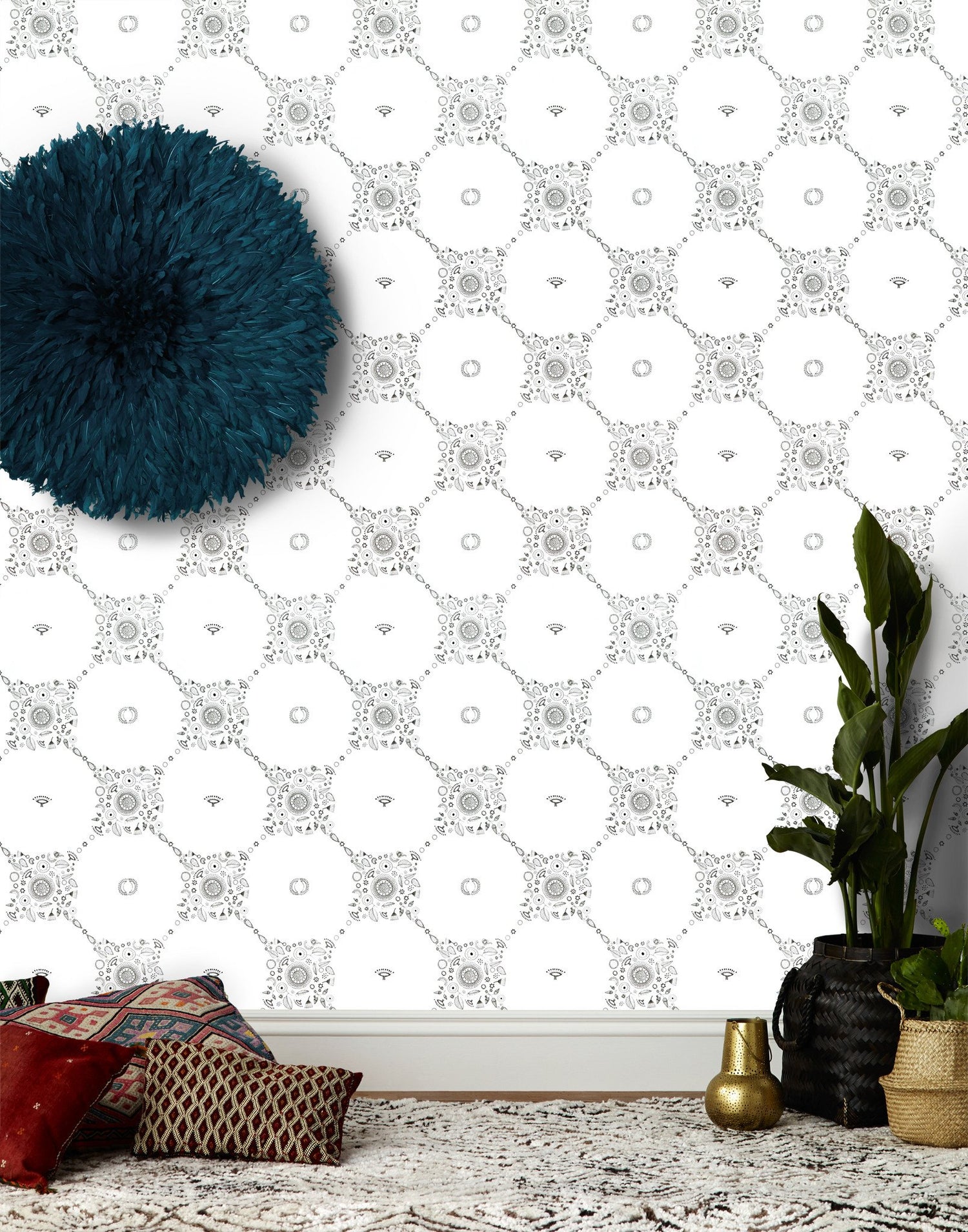 Inspired by the sun and moon in Suzani motifs, line drawings from the women painters of Mithila and a dizzying trip to Fez, Morocco, Fez wallpaper is meant to have a double effect. From afar the trellis shape invites onlookers to come closer, and once close, the magical symbols of suns, moons, stars and flowers appear.