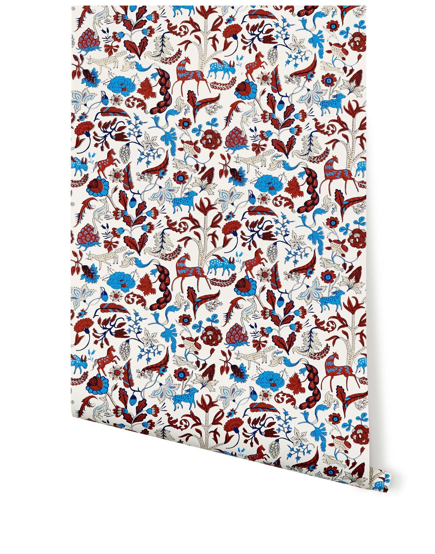 Foret was inspired by Indian Chintz wall hangings from the 1600s, and updated for modern walls. Attracted to the interesting flowers, unique animals and intricate vignettes, Julia incorporated similar motifs in her own personal style.