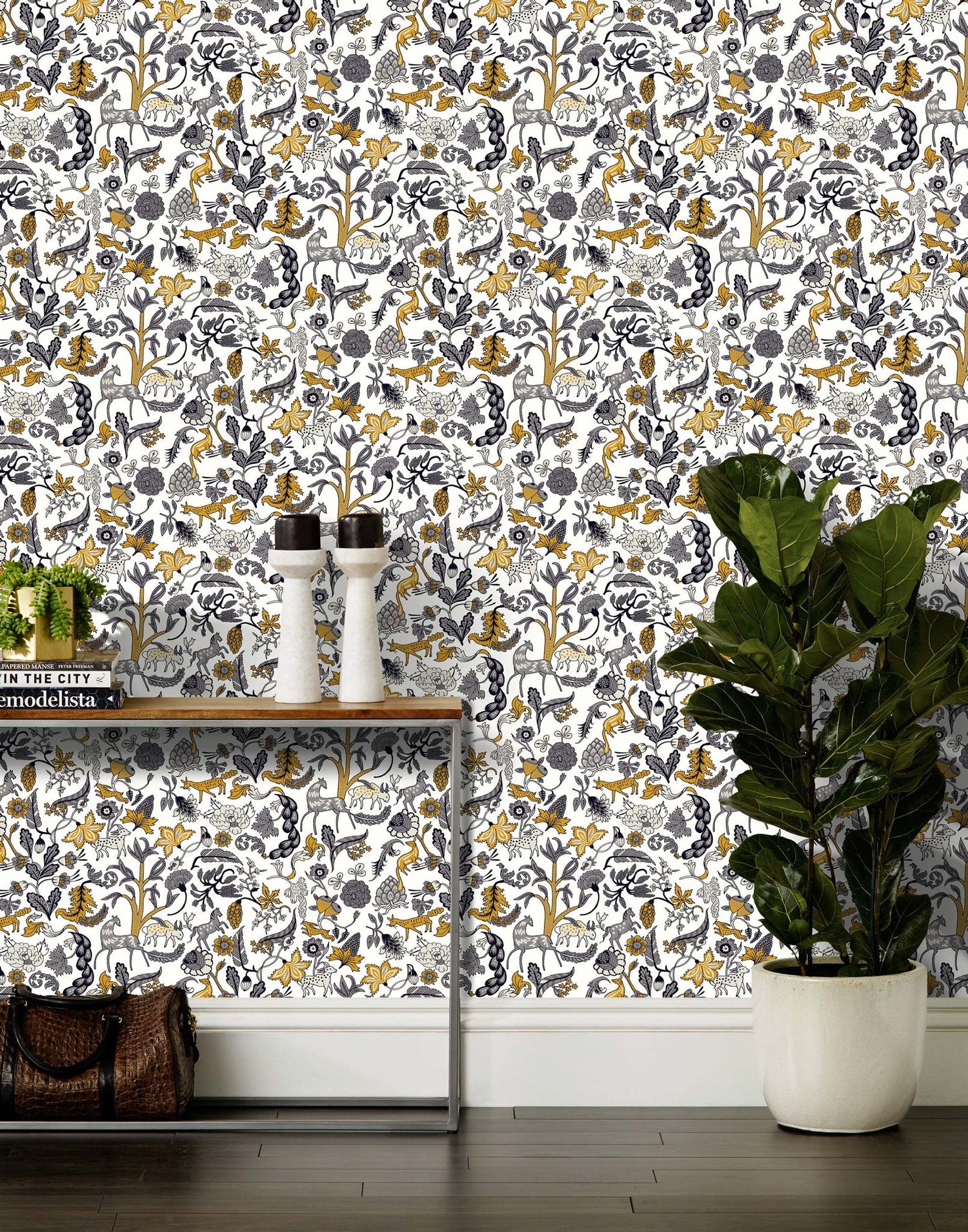 Foret was inspired by Indian Chintz wall hangings from the 1600s, and updated for modern walls. Attracted to the interesting flowers, unique animals and intricate vignettes, Julia incorporated similar motifs but in her own personal style.
