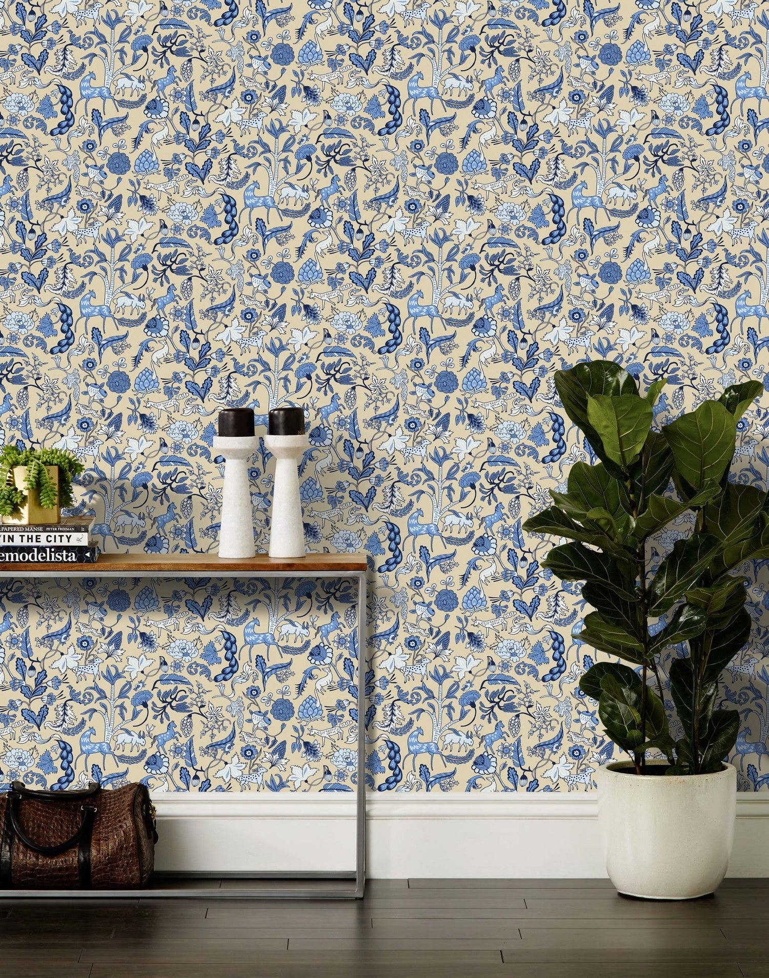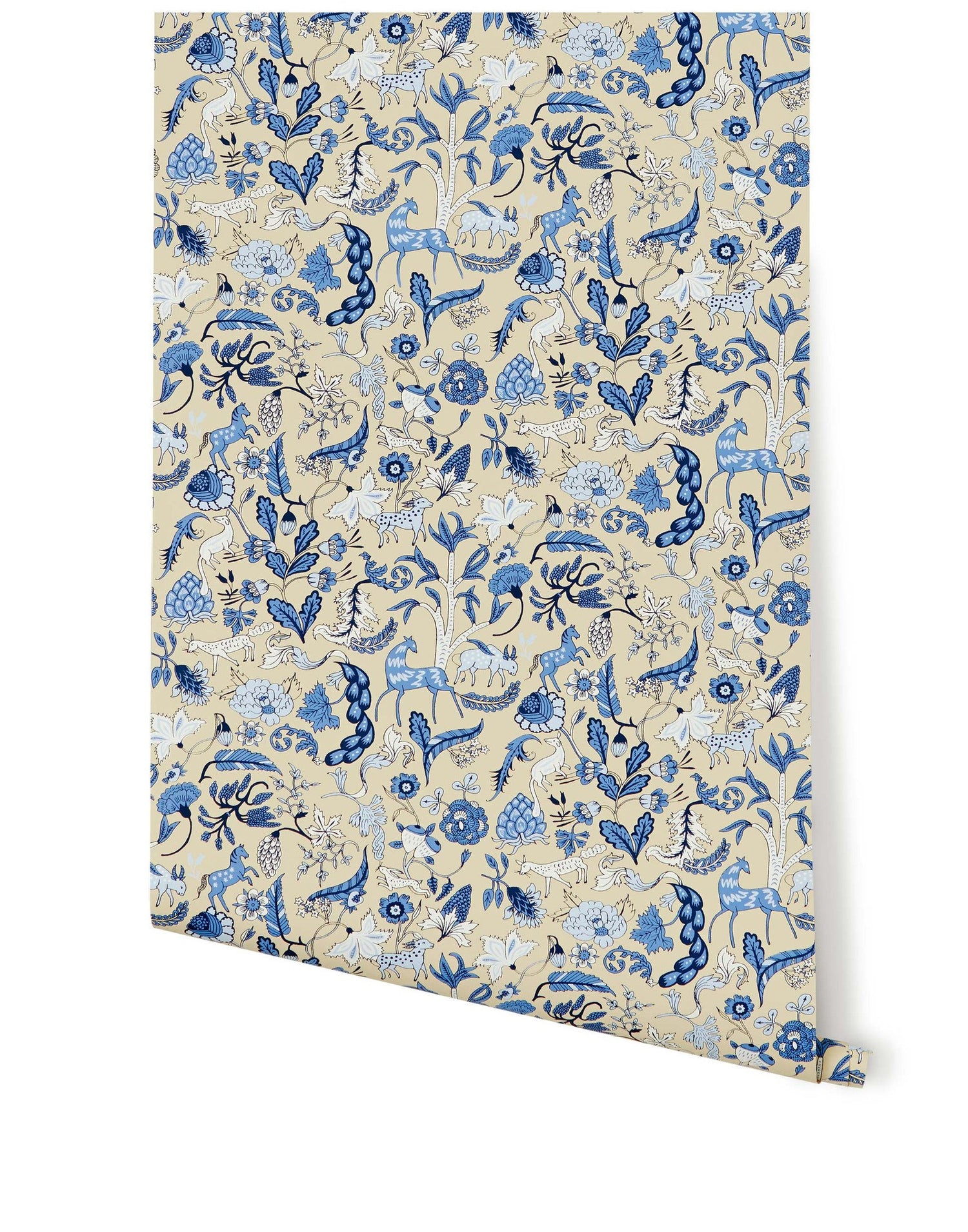Foret was inspired by Indian Chintz wall hangings from the 1600s, and updated for modern walls. Attracted to the interesting flowers, unique animals and intricate vignettes, Julia incorporated similar motifs in her own personal style.