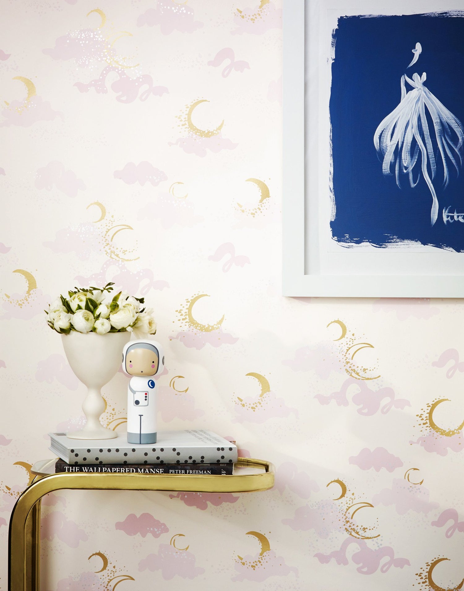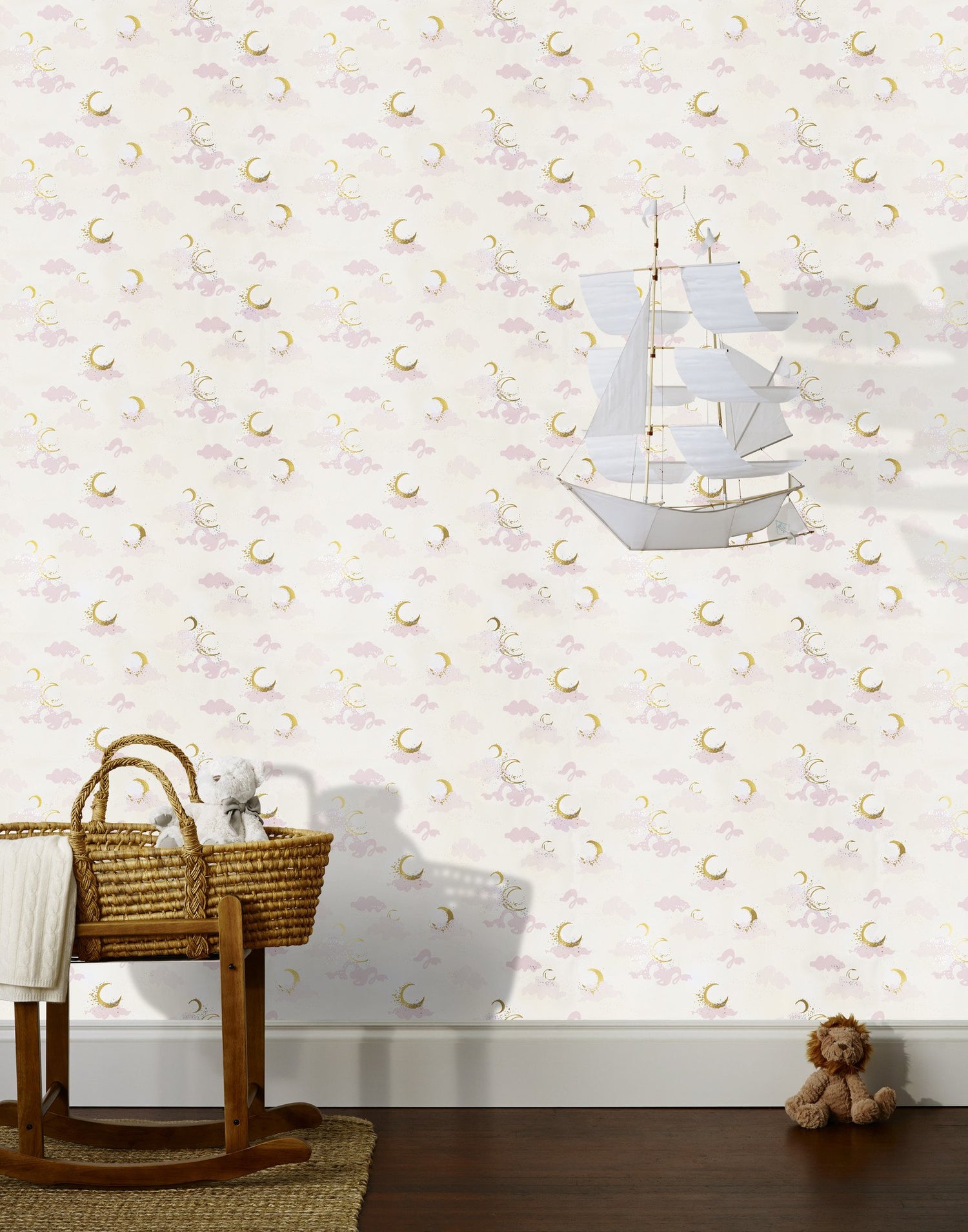 Metallic gold moons, silver stars, light and medium pink clouds on an off white background