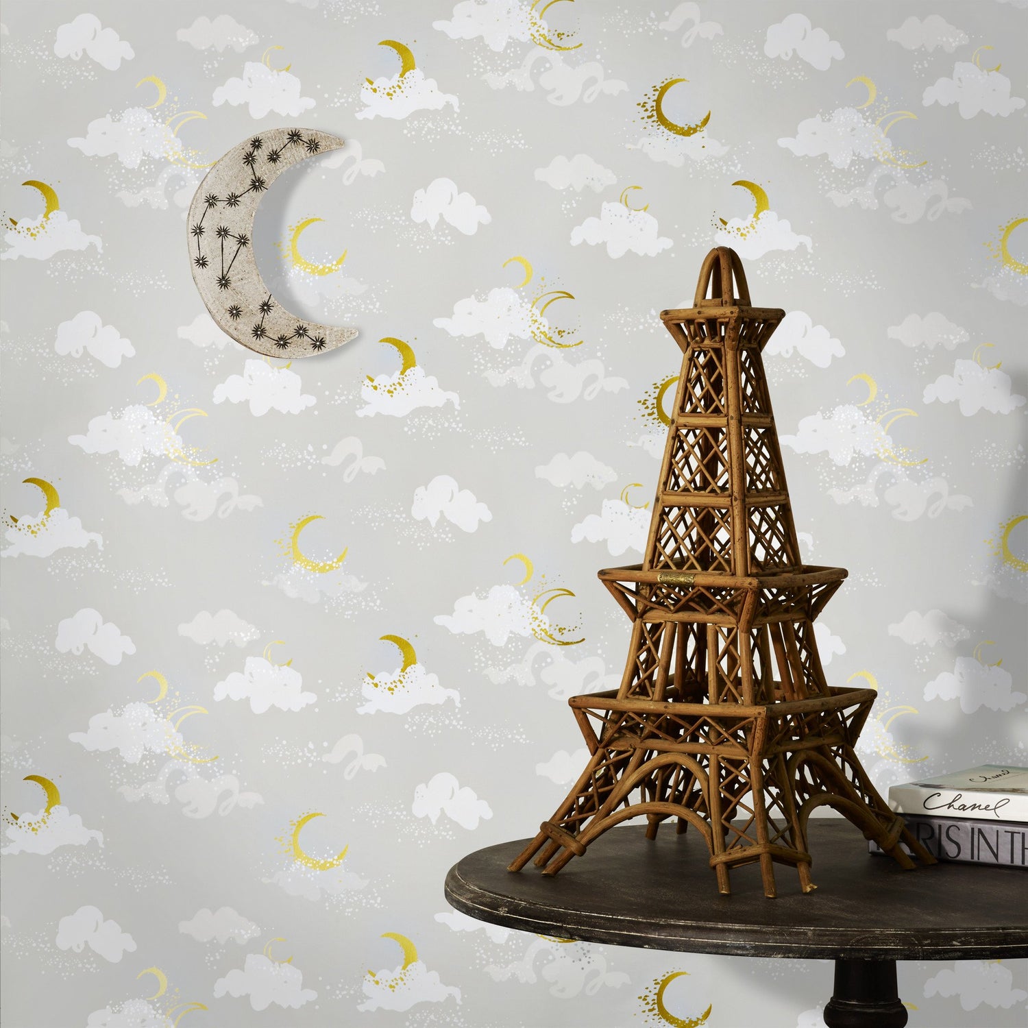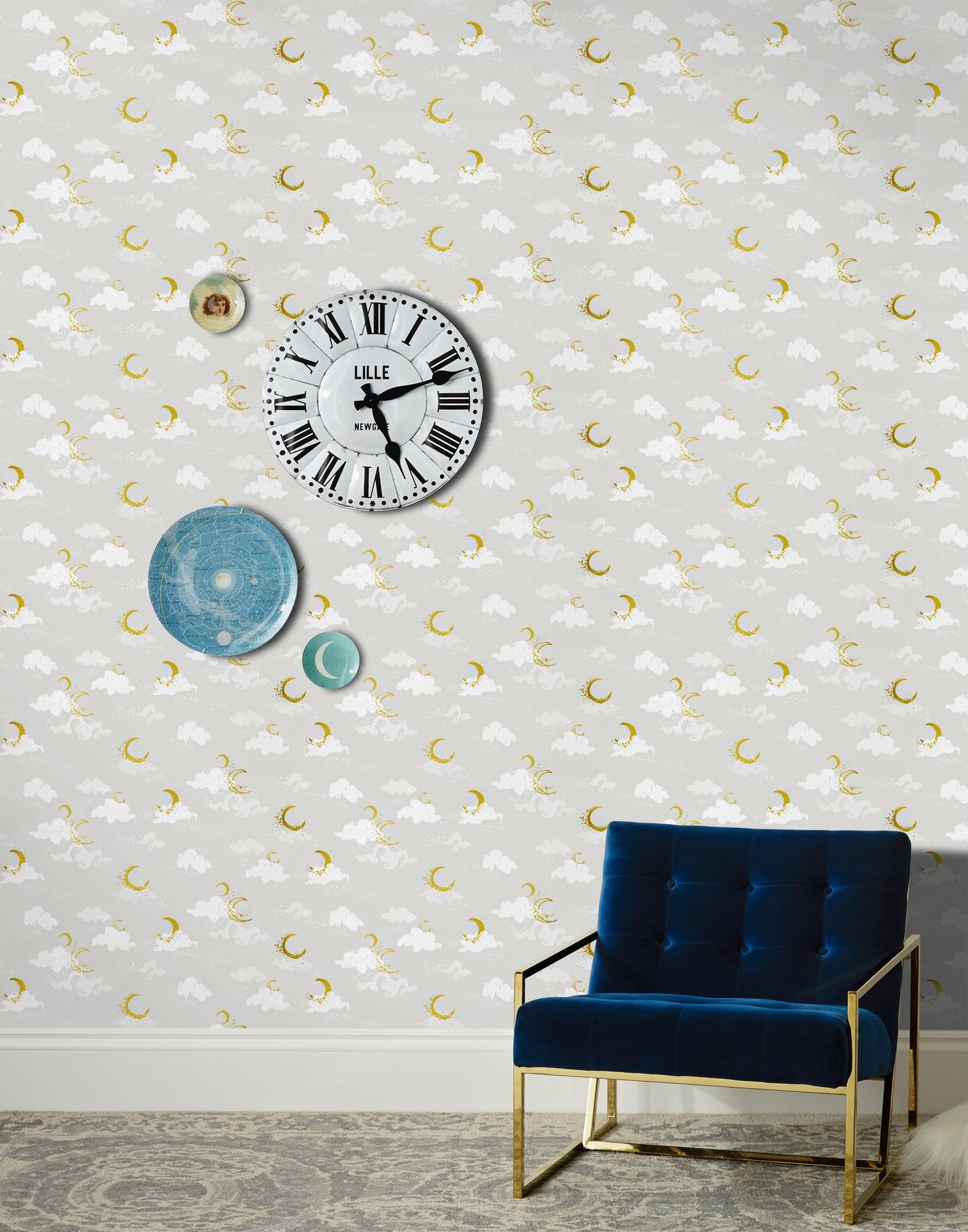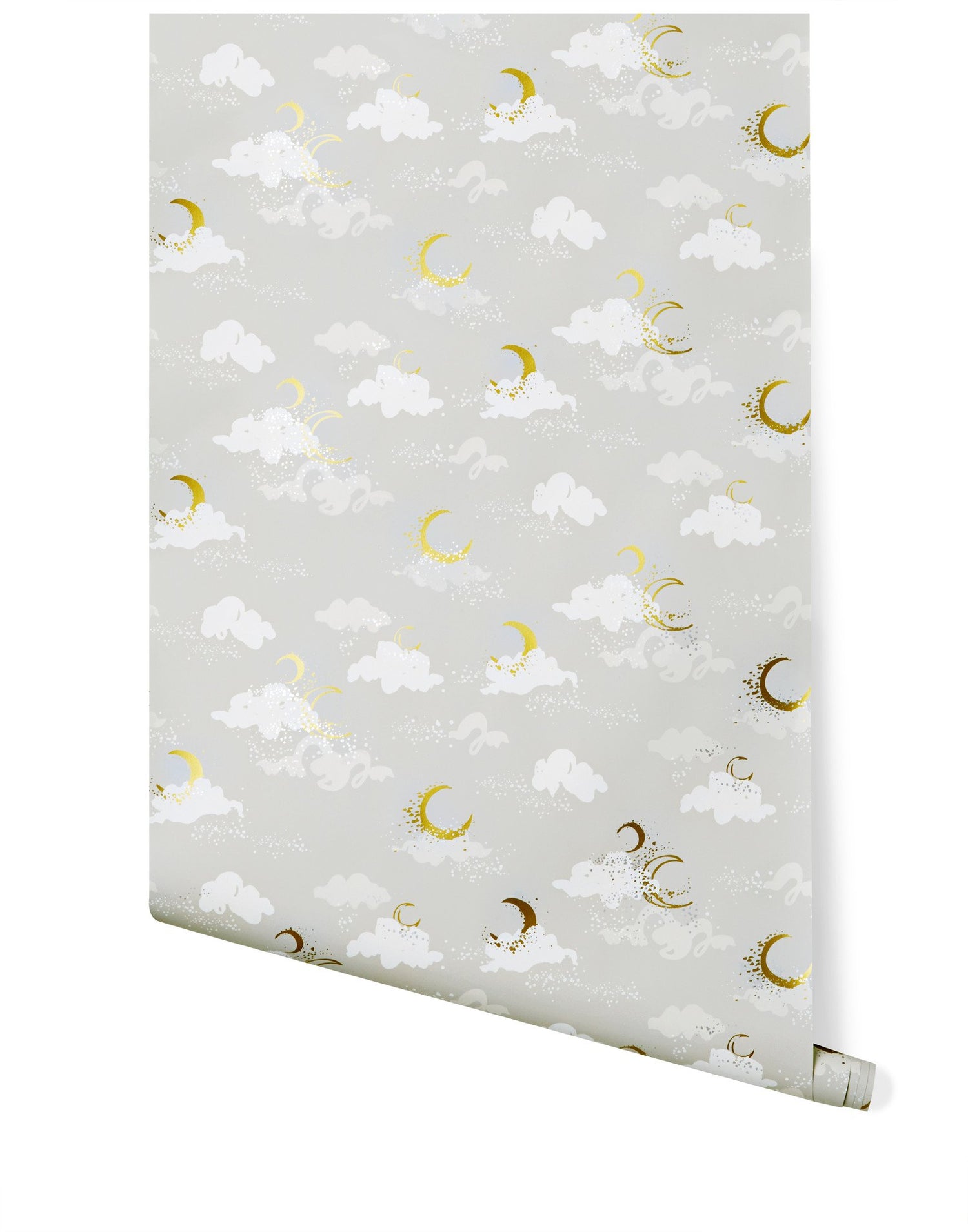Metallic gold moons, silver stars, off white and light gray clouds on a soft gray background