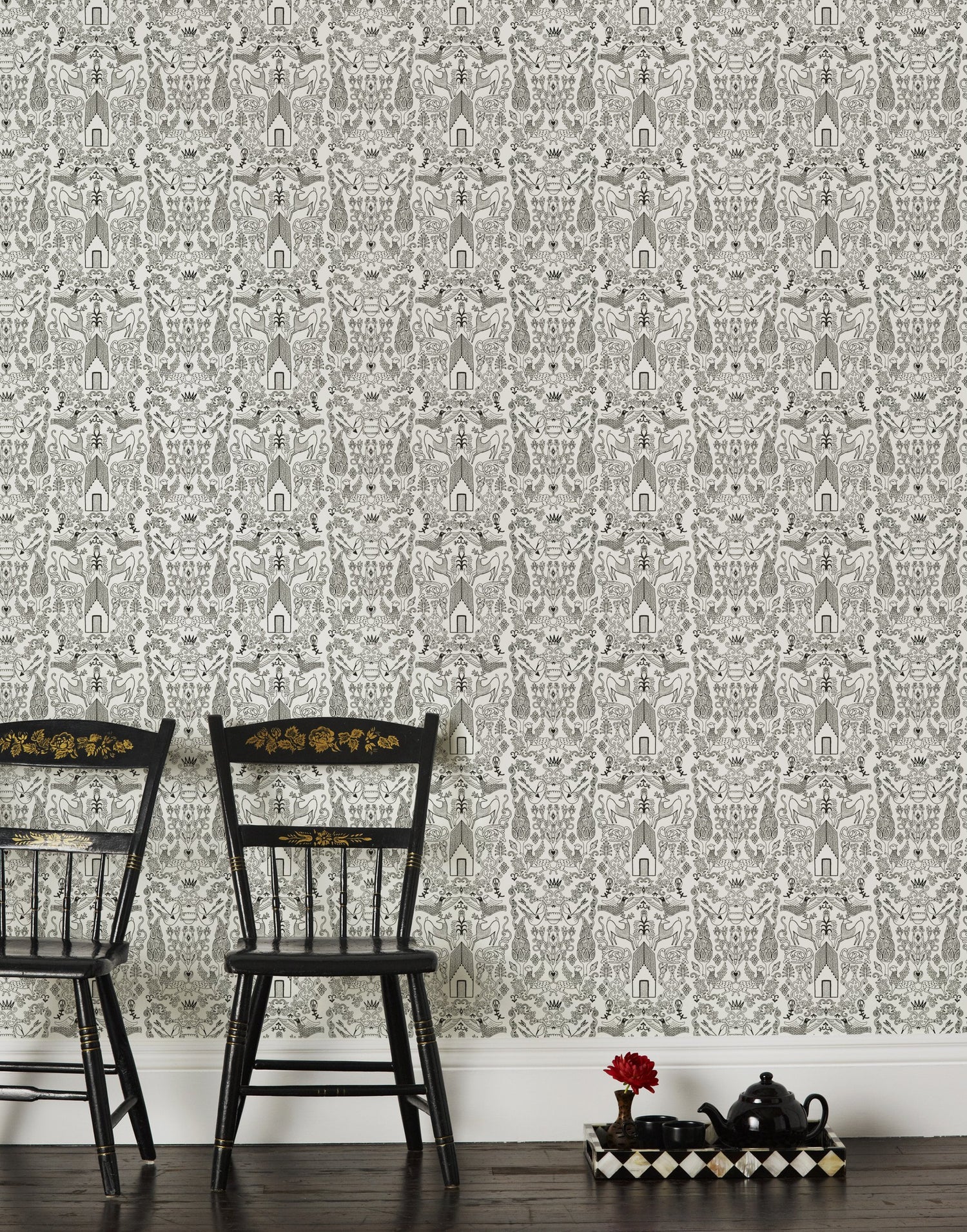 Traditional meets modern in this playful wallpaper pattern. We named this design after a small country home in Northern England with a sprawling manicured garden complete with deer and swans.