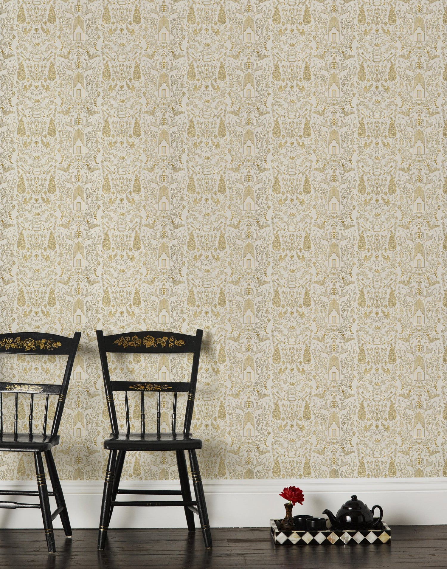 Traditional meets modern in this playful wallpaper pattern. We named this design after a small country home in Northern England with a sprawling manicured garden complete with deer and swans.