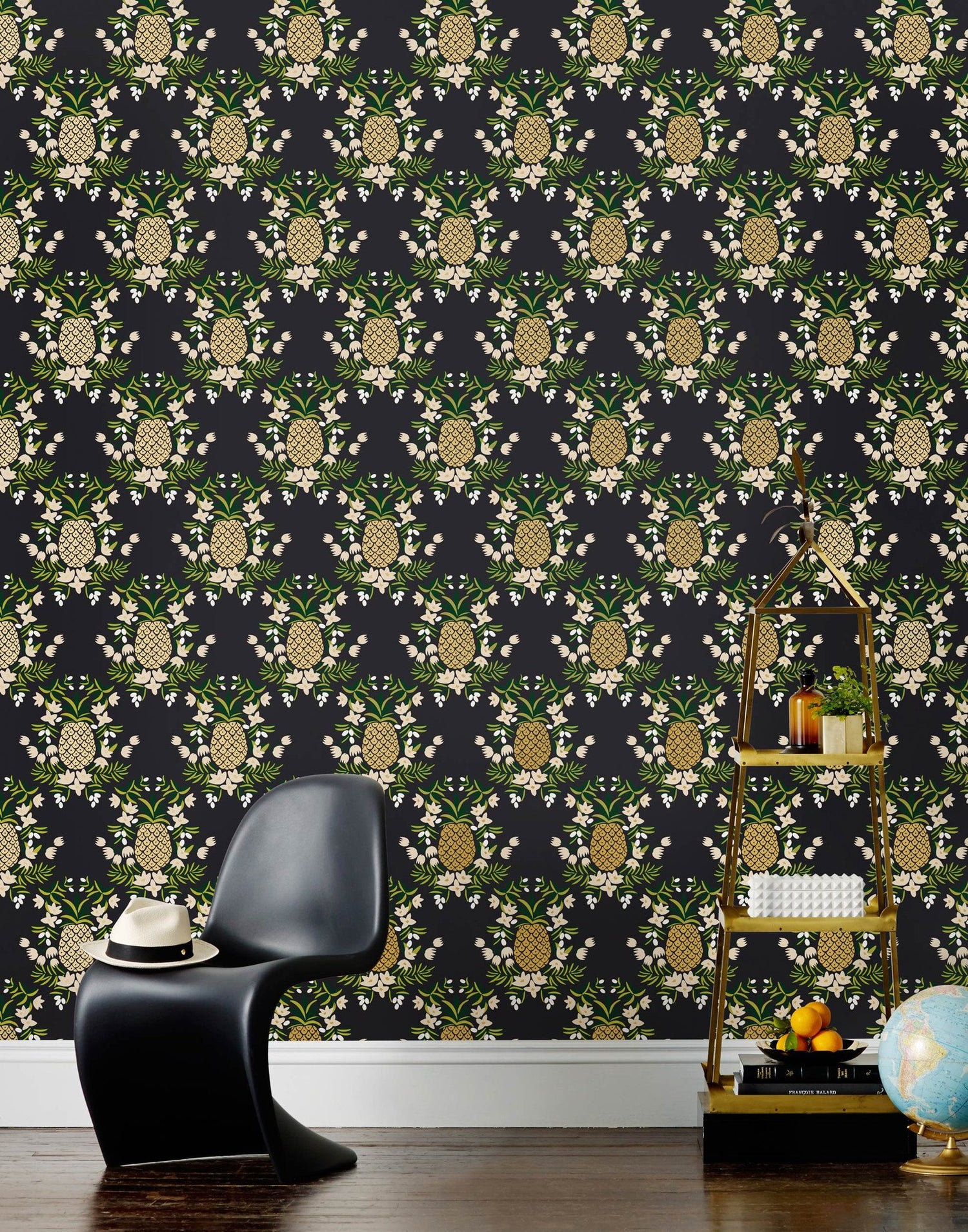 Gold pineapples, green leaves, nude and white florals on a soft black background