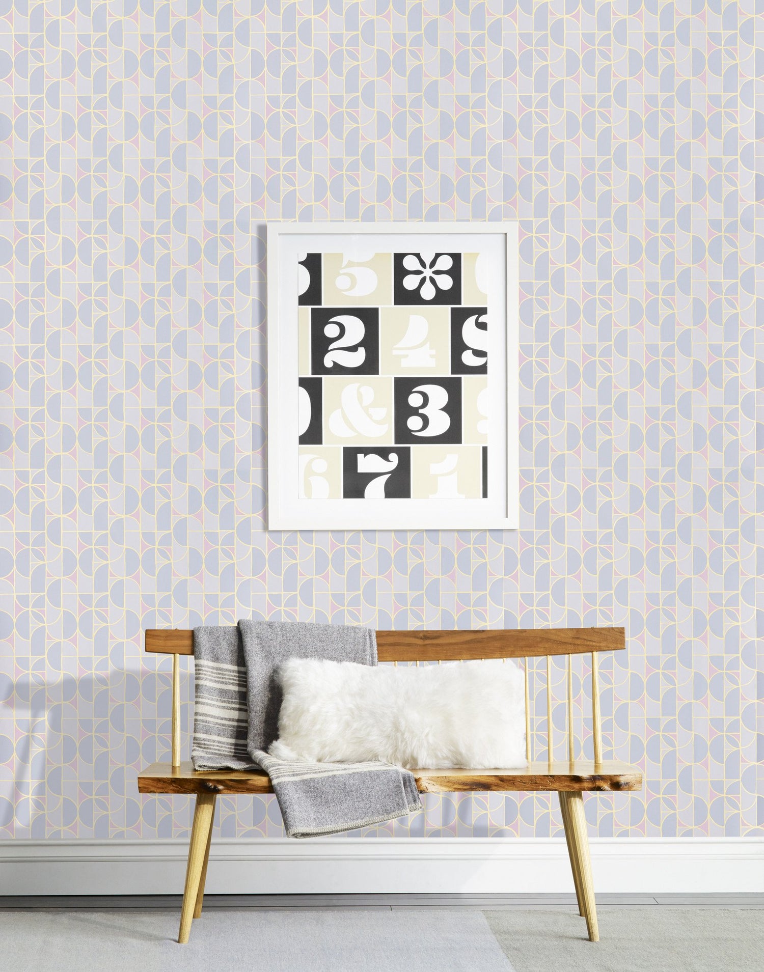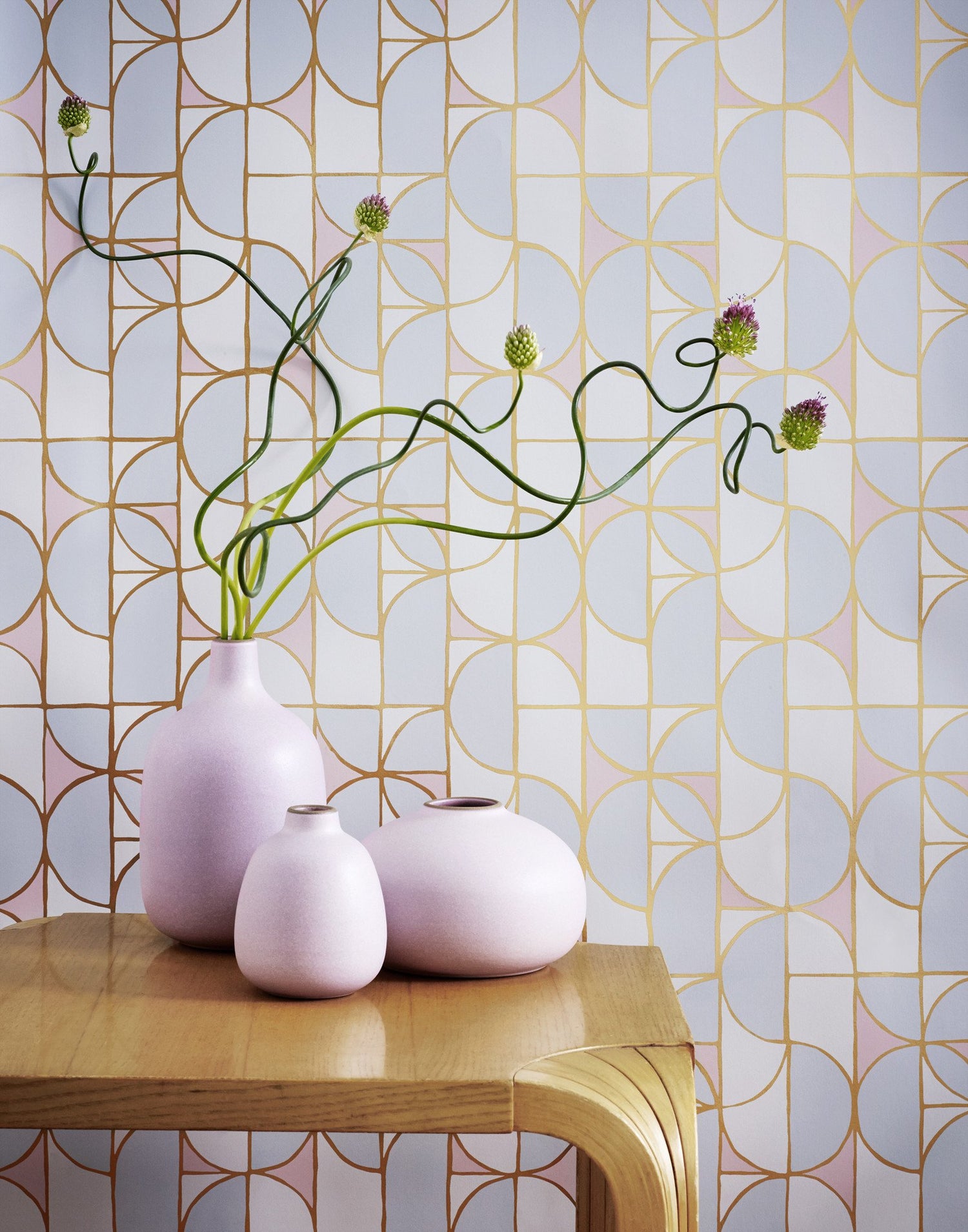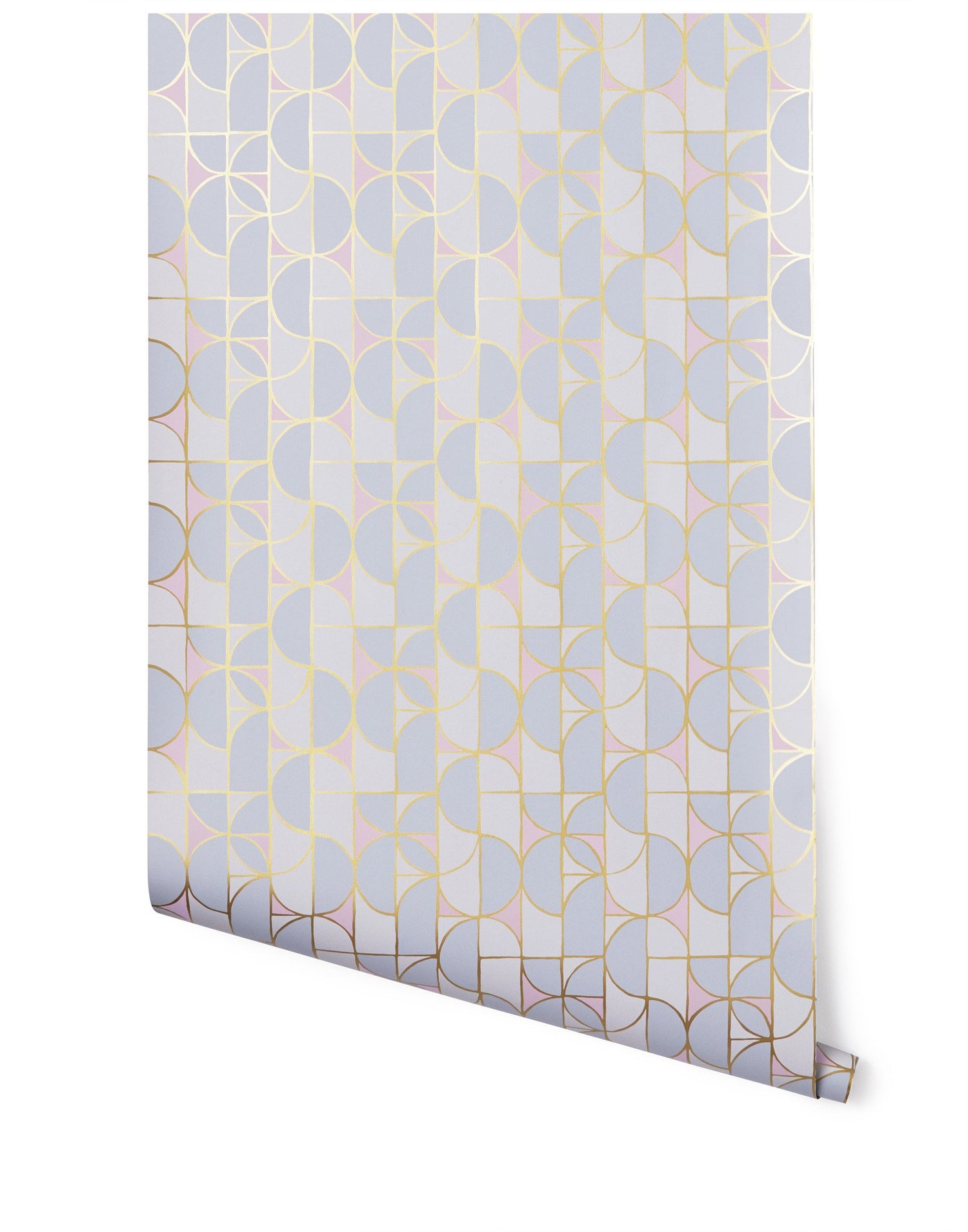 Light gray and pink shapes outlined with metallic gold on a light, dusty blue background