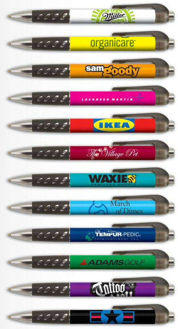 Setup: FREE one or two color imprint when selecting a background color above $48 Setup Fee if submitting your own background color (Must provide PMS Color) Trim: Chrome Imprint Area: 2.48" x 1.3" (See Sample Below) 5 Lines - 35 Total Spaces & Characters per line Ink: Black Ink Standard, Blue Ink Optional Point: Medium Ballpoint Pack: 100 per box Weight: 2.5 lbs per box of 250 CT Leadtime: 5 Business Days