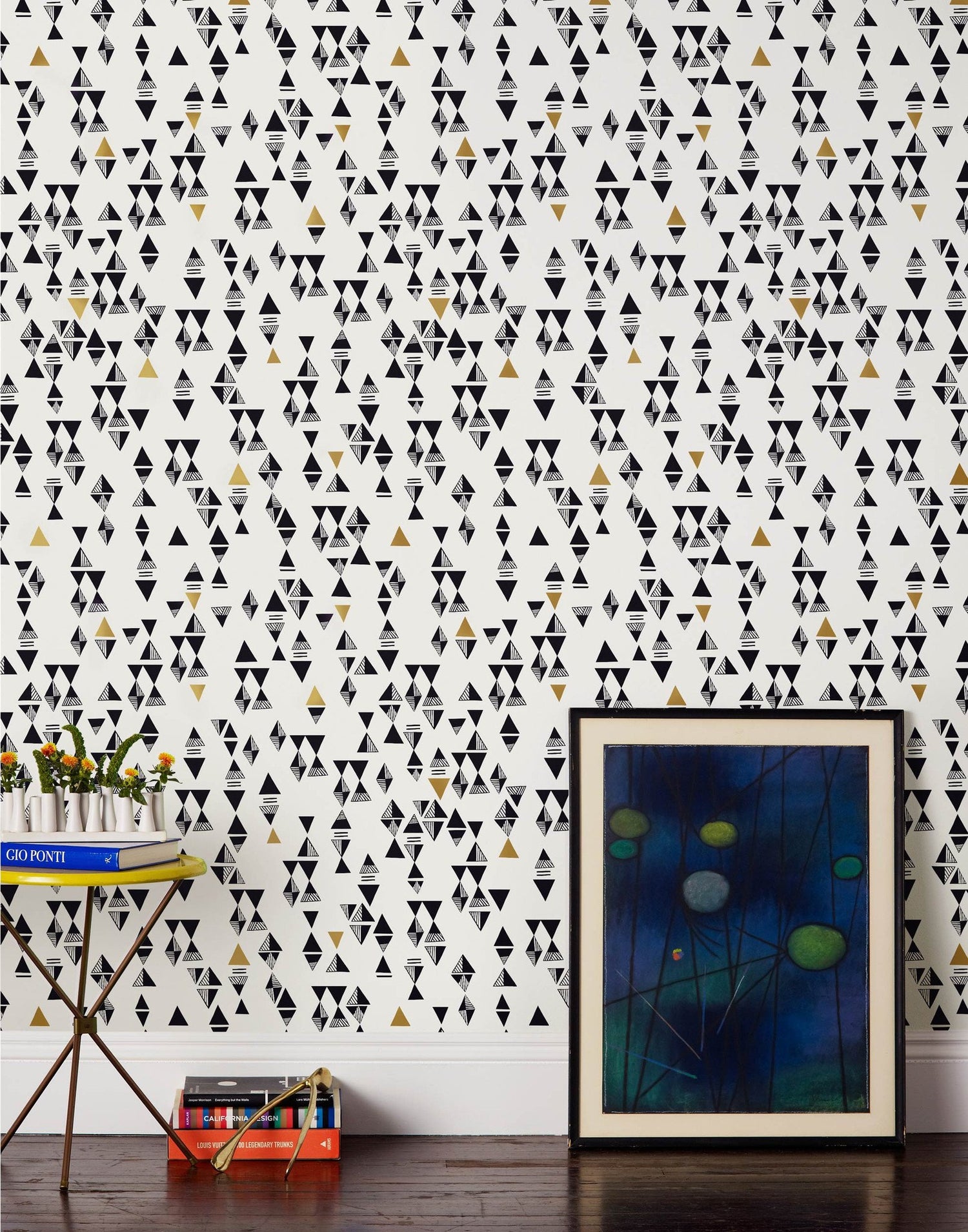 Charcoal and gold triangles on an off white background