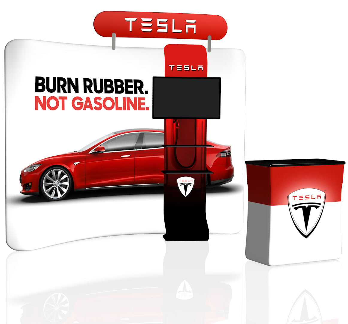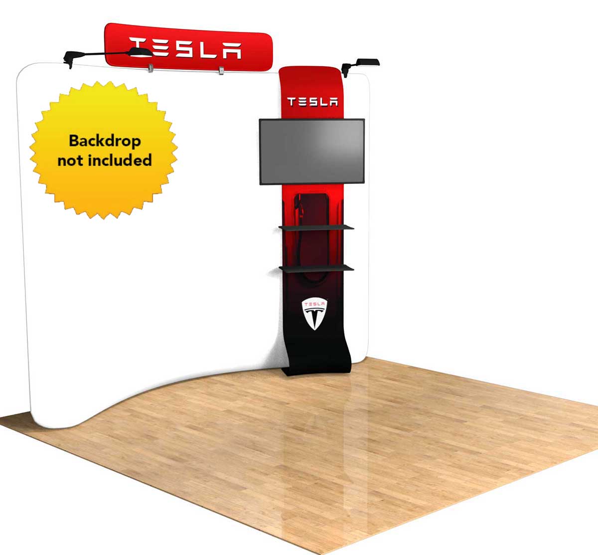 By popular demand, Display Overstock is proud to present the Tru-Fit MAX Media Kit add-on! This stunning, lightweight media add-on brings a new dimension to our Tru-Fit line of trade show displays*. Stop wasting money renting TV stands at trade shows or trying to ship the old school, heavy monitor stands around. Fitting into a single case for easy transport, the Tru-Fit media kit is the best solution in the industry for your trade show booth's media needs. Not only does this incredible trade show kit have a monitor mount for a TV up to 40", but it also boasts an attention-grabbing custom printed header for extra brand marketing. Let's not forget the two product shelves that attach to display key products during your event or trade show. The Tru-Fit MAX add-on is designed to be used in conjunction with our 8' Tru-Fit Curved/Straight, 10' Tru-Fit Curved/Straight, and 20' Tru-Fit Curved/Straight/Serpentine displays. Make sure you have one of these breathtaking backdrops to accompany your new Tru-Fit Media Kit add-on! Check out our blog post HERE for a quick tutorial on how to set up the monitor bracket! Featured Package Includes: (1) Waterfall TV Stand Tension Fabric Graphic Print (1) Waterfall TV Stand Snap-Tube Frame(2) Black Aluminum Shelf kits (Supports up to 20lbs each)(1) TV Monitor Bracket (Supports up to 40" TV)** Optional Add-Ons: (1) Header Snap-Tube Frame(1) Header Tension Fabric Graphic Print * Tru-Fit Media Kit Add-On must be used with an 8', 10', or 20' Tru-Fit frame design **TV Mount is VESA compliant with 200x200, 200x400, 300x300 or 400x400 mm
