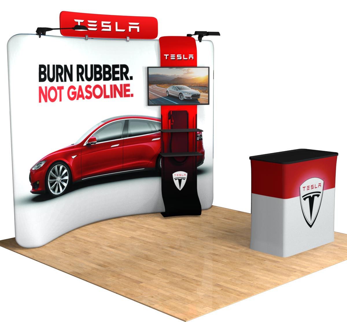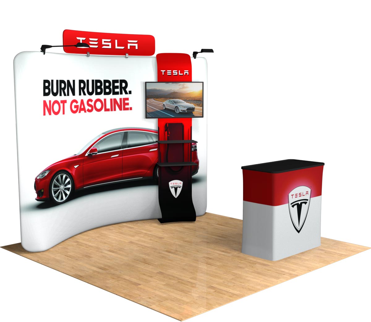 The 10ft Tru-Fit MAX Curved is our top selling media package and a true crowd-pleaser. The backdrop starts with our most popular display of all time, the 10ft Tru-Fit Curved, and tops it off with a top header (with two height options), and a TV stand with a printed graphic and shelves. The best part is that the entire kit will fit into a hard transport case that also converts into a podium, adding a multi-use bonus to the display. No one will know what small effort it took you to achieve such an incredible trade show display at your exhibitions and trade events. Check out our blog post HERE for a quick tutorial on how to set up the monitor bracket! Featured Package Includes: (1) 10ft High Resolution Zippered Tension Fabric Graphic Print (1) 10ft Aluminum Snap-Tube Frame(1) Header Tension Fabric Graphic Print (1) Header Snap-Tube Frame(1) Waterfall TV Stand Tension Fabric Graphic Print(1) Waterfall TV Stand Snap-Tube Frame(2) Black Aluminum Shelf kits (Supports up to 20 lbs each)(1) TV Monitor Bracket (Supports 40" TV up to 32 lbs)**(2) LED Lights (1) Durable Hard Case* with Wheels(1) Podium Conversion Kit, With Custom Graphic Print Let us design for you! Standard Design Services are offered at set rates based on 3 hours of work for backdrop only, and 4 hours for backdrop + podium design (single sided backdrop). Simply send us all of the design elements such as your logos, text, pictures, and anything else you would like included, and our team of experienced designers will create a custom, professional, and effective design for you! Please note: Double-Sided print designs will require additional design services IF the back side design is different from the front side. Additional design time will be assessed on a per project basis. For more information on our design services, CLICK HERE. *Case is designed for transport only. We highly recommend saving and reusing the cardboard shipping carton for future shipping purposes**TV Mount is VESA compliant with 200x200, 200x400, 300x300 or 400x400 mm