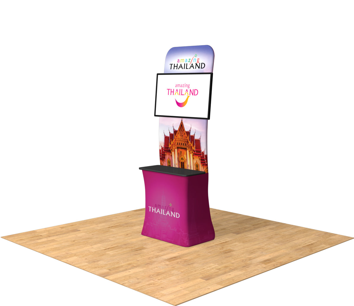 Innovative and lightweight media display that skyrockets your branding and trade show ROI? Check. Functions as a stand-alone exhibit or enhances your full trade show booth? Check. Don’t settle for the same old monitor-on-a-table when you can elevate your presentation, professionalism, and draw more traffic with this cutting edge tension fabric kiosk! The Tru-Fit Broadcast TV Counter is a presentation genius, and will take your exhibiting game to the next level. Custom printed tension fabric print, lightweight snap-tube aluminum frame, monitor mount and counter space that will allow you to showcase a product or even hold a keyboard and mouse – our Tru-Fit series Monitor Kiosk has the versatility for any event you’re attending.Featured Package Includes:(1) High-Resolution Fabric Dye-Sub Graphic(1) Snap-Tube Aluminum Frame(1) Monitor Mount (Supports a TV up to 42")(1) Black Counter Top Piece(1) Soft Carrying Case