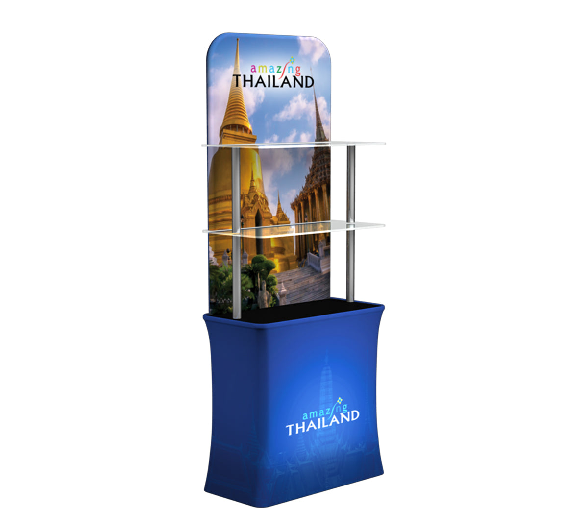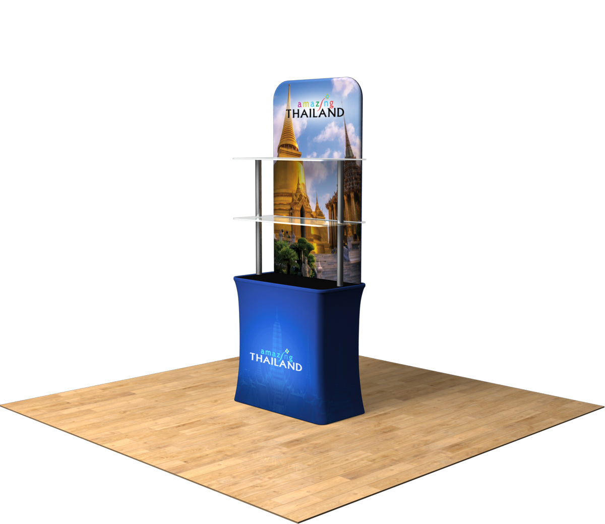 The tension fabric revolution continues! The next stage in portable displays is here with our new Shelving Kiosk taking your trade show booth to the next level! No more boring tables to display your products or collateral – now you can professionally showcase items while increasing your brand marketing. This Tru-Fit series event display can be an add-on to complete your booth, or used as a stand-alone exhibit, that includes a high-resolution fabric dye-sub graphic, 2 acrylic shelves, and a lightweight aluminum snap-tube frame that’s extremely easy to assemble. At your next trade show, event, or convention, this fabulous Merchandiser shelves counter will draw more attention and have that polished image that will make your show a success! Featured Package Includes: (1) High-Resolution Fabric Dye-Sub Graphic(1) Snap-Tube Aluminum Frame(2) Acrylic Shelves(1) Black Counter Top Piece(1) Soft Carrying Case