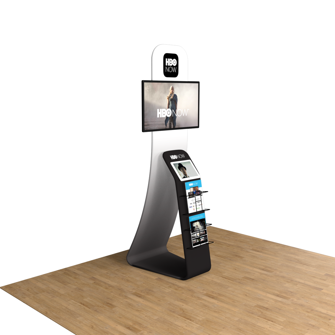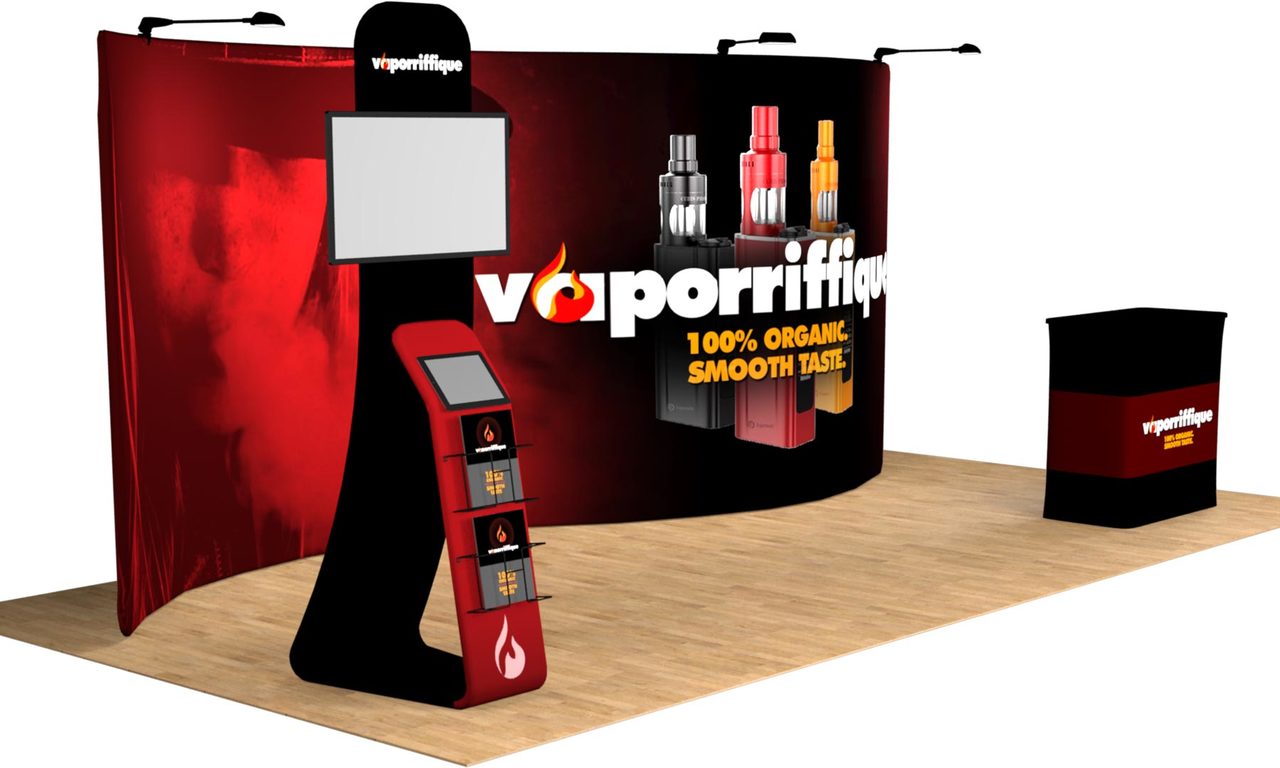 Vape Bundle 8: 20ft Tru-Fit Serpentine + Infinity iPad + Monitor Kiosk The Tru-Fit 20' Serpentine trade show display is one of the most dynamic looking booths with its S-shape design and sleek and modern look, this display will surely be a head turner! Not only does it have a powerful snake-like shape, but the seamless graphic and lightweight frame make it the most convenient 20ft trade show display on the market. Perfect for exhibiting your products and services at conventions, conferences, and other events. This package conveniently packages into a single hardshell case. The hardshell case converts in the podium with has custom graphics for extra vape branding! Perhaps the most eye catching of the 10x20 trade show booth solutions! The Infinity - iPad + Monitor Kiosk is an all-in-one marketing powerhouse, this is the future of media at trade show booths! the perfect addition to top off any vape trade show booth. This elegant Tru-Fit media display is the Swiss Army Knife of events; it features a monitor mount, a universal tablet holder, and two literature holders - all included! The stand-alone monitor mount includes a high-resolution fabric dye-sub graphic and a lightweight aluminum snap-tube frame. This media display is a one-stop-shop, guaranteed to increase foot traffic and ROI while attending any vape trade show, vape event, or vape convention. Optional add-ons include (2) Additional LED lights, double-sided print, and our in-house design services. Featured Package Includes:(1) High Resolution Zippered Tension Fabric Graphic Print (1) 20' Aluminum Snap-Tube Frame(1) Durable Hard Case* w/ Podium Conversion Kit(1) Podium Graphic PrintValue of: $1999.99Optional Upgrades:(2) Additional LED Lights(1) Double-Sided Graphic Featured Package for the Infinity - Ipad + Monitor Kiosk Includes:(1) High-Resolution Fabric Dye-Sub Graphic(1) Snap-Tube Aluminum Frame(1) Monitor Mount (Supports a TV up to 32")(1) iPad/Tablet Holder(2) Literature Holders(1) Soft Carrying CaseValue of: $799.99 Let us design for you! Standard Design Services are offered at set rates based on 6 hours for backdrop + podium design (single sided backdrop). Simply send us all of the design elements such as your logos, text, pictures, and anything else you would like included, and our team of experienced designers will create a custom, professional, and effective design for you! Please note: Double-Sided print designs will require additional design services IF the back side design is different from the front side. Additional design time will be assessed on a per project basis. For more information on our design services, CLICK HERE.