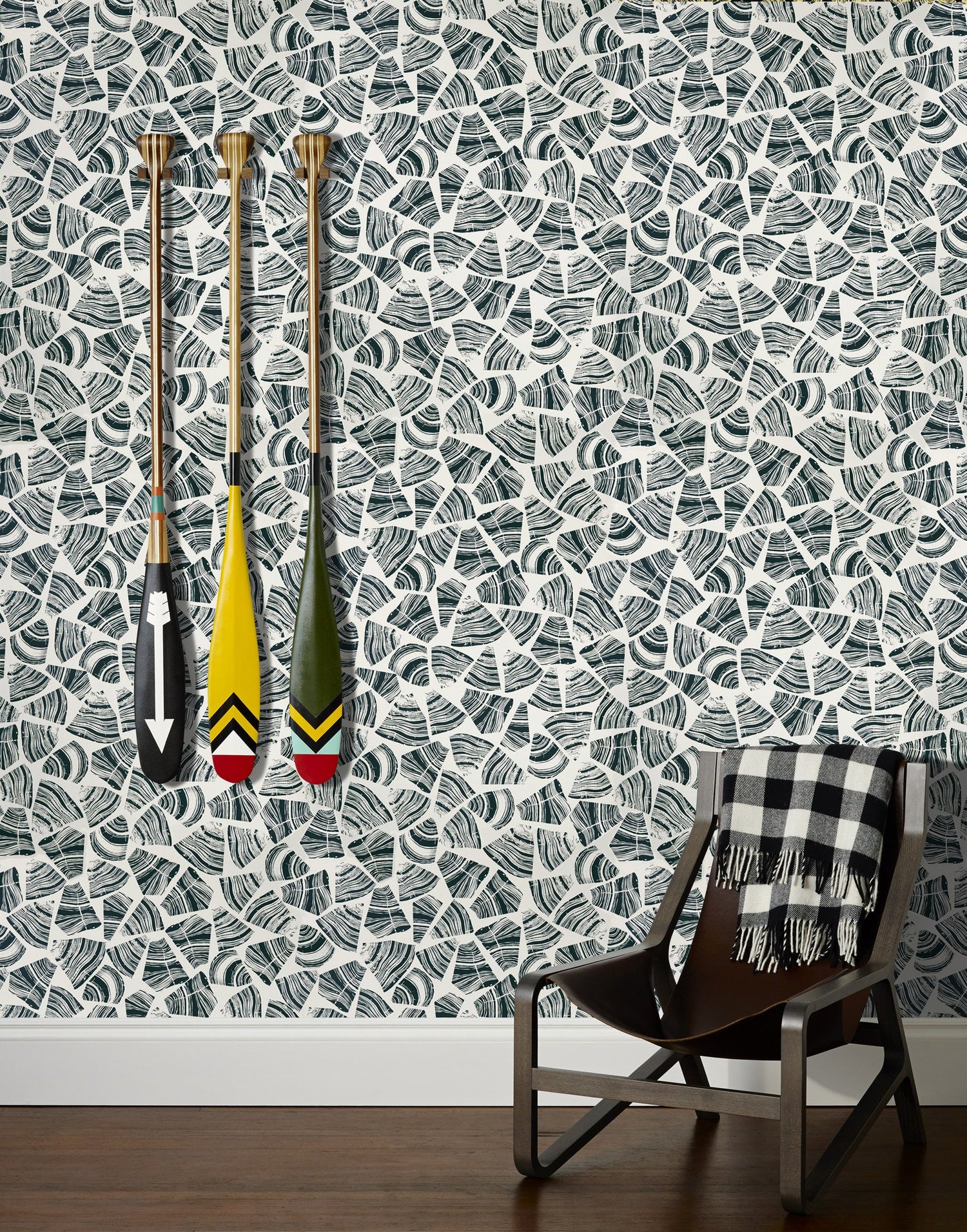 This pattern is inspired by cross sections of firewood, revealing the history inside each tree. It almost appears as though the cut ends have been used to stamp our Wood wallpaper, giving this design a graphic, organic feel.